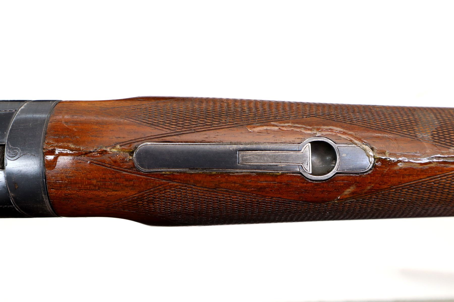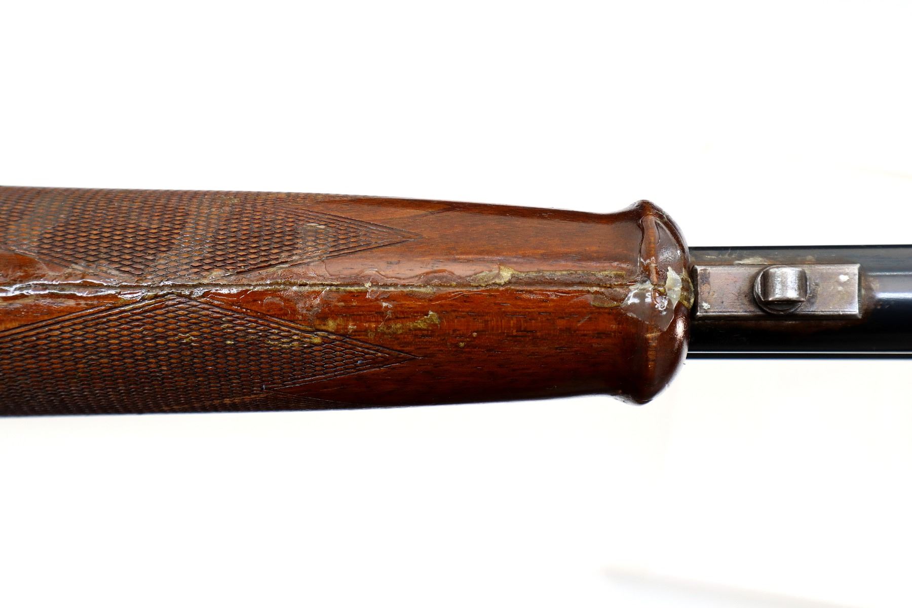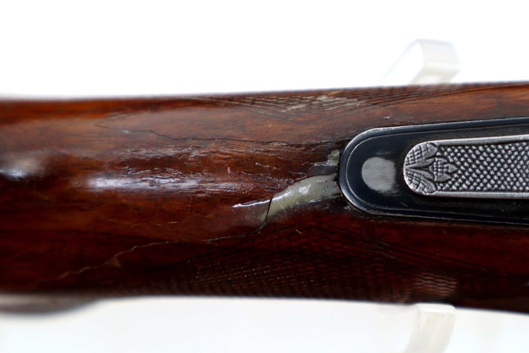 Main Description: Orange fiber optic front bead, blued finish, vent rib, manual safety, action does not function or fire correctly, missing bottom ejector, single trigger. Two piece wood stocks, checkered forearm which is broken and repaired, checkered Pistol grip chipped and cracked behind receiver, grooved black polymer butt plate. Missing rear swivel hole is present has a front swivel stud.