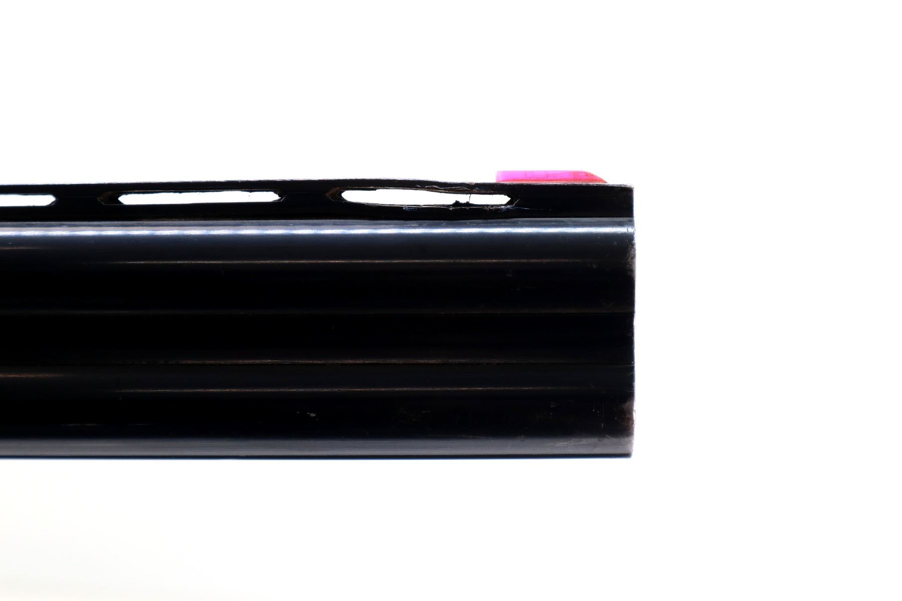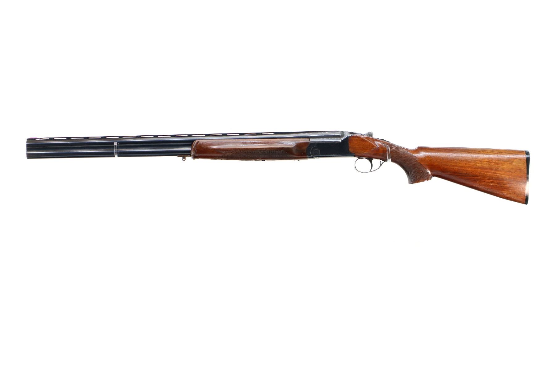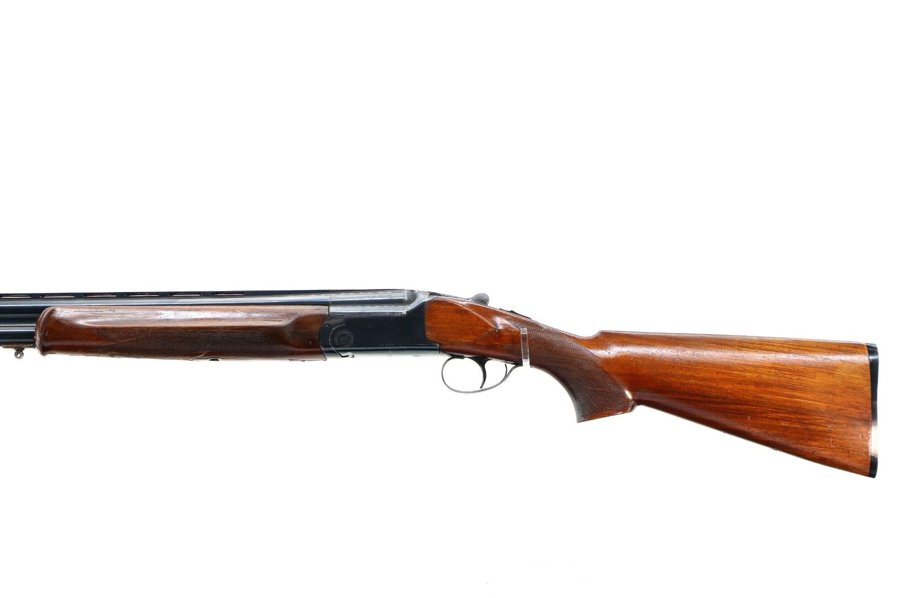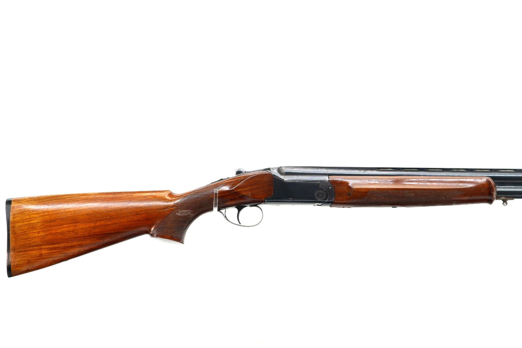 Main Description: Orange fiber optic front bead, blued finish, vent rib, manual safety, action does not function or fire correctly, missing bottom ejector, single trigger. Two piece wood stocks, checkered forearm which is broken and repaired, checkered Pistol grip chipped and cracked behind receiver, grooved black polymer butt plate. Missing rear swivel hole is present has a front swivel stud.