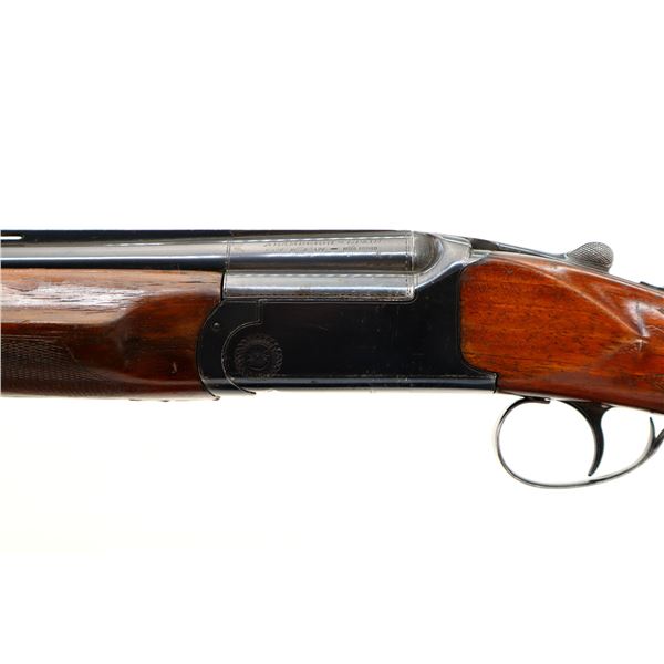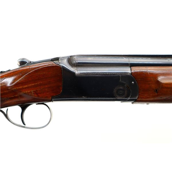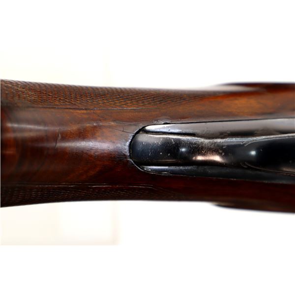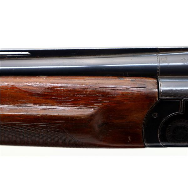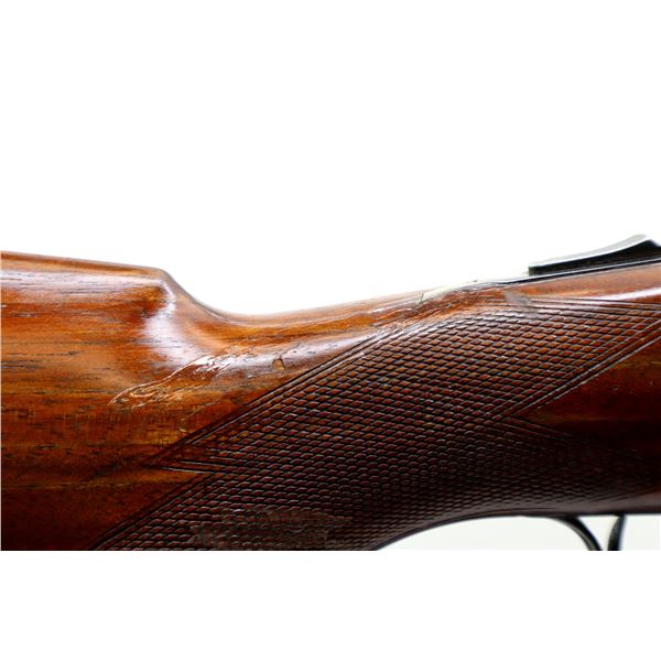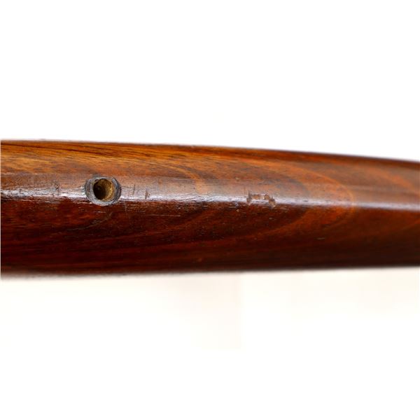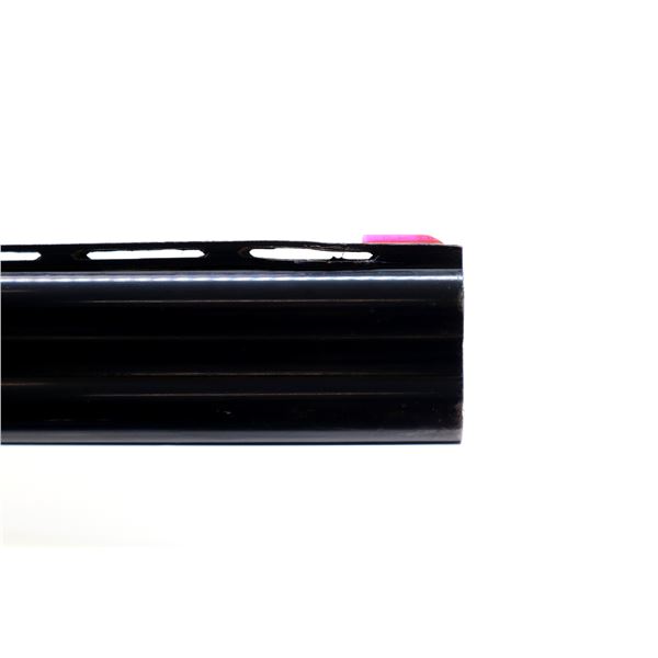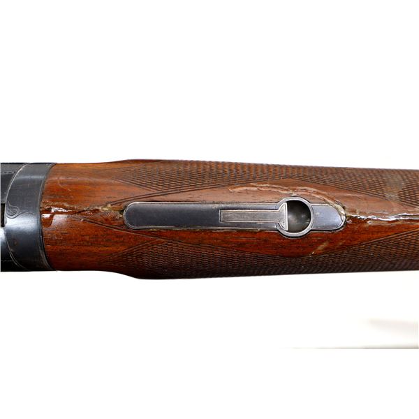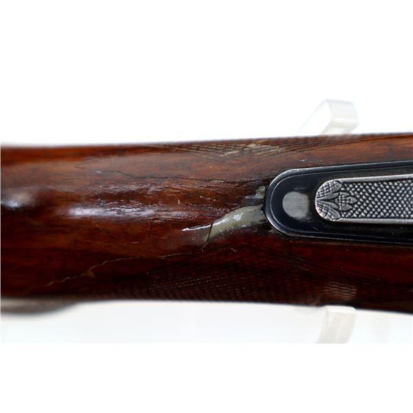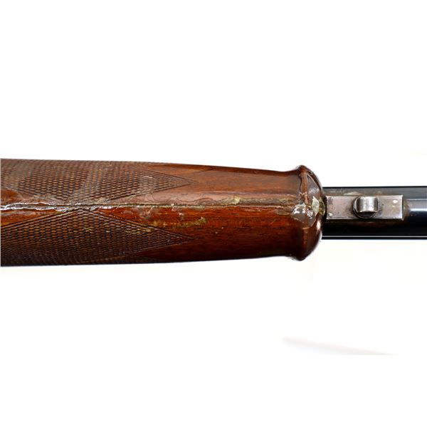 Main Description: Orange fiber optic front bead, blued finish, vent rib, manual safety, action does not function or fire correctly, missing bottom ejector, single trigger. Two piece wood stocks, checkered forearm which is broken and repaired, checkered Pistol grip chipped and cracked behind receiver, grooved black polymer butt plate. Missing rear swivel hole is present has a front swivel stud.