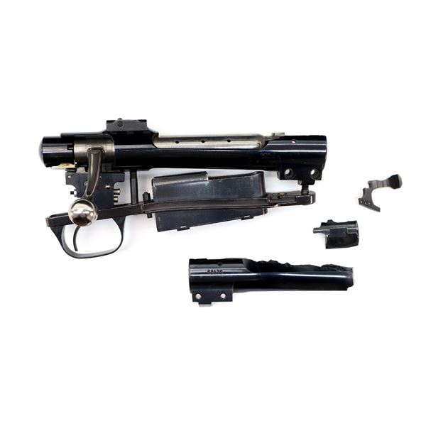 Main Description: This rifle has a broken receiver, damaged bolt and barrel extension, being sold as parts only. Includes: trigger mech and bent trigger guard. Blued finish, missing small parts and complete stock assembly.