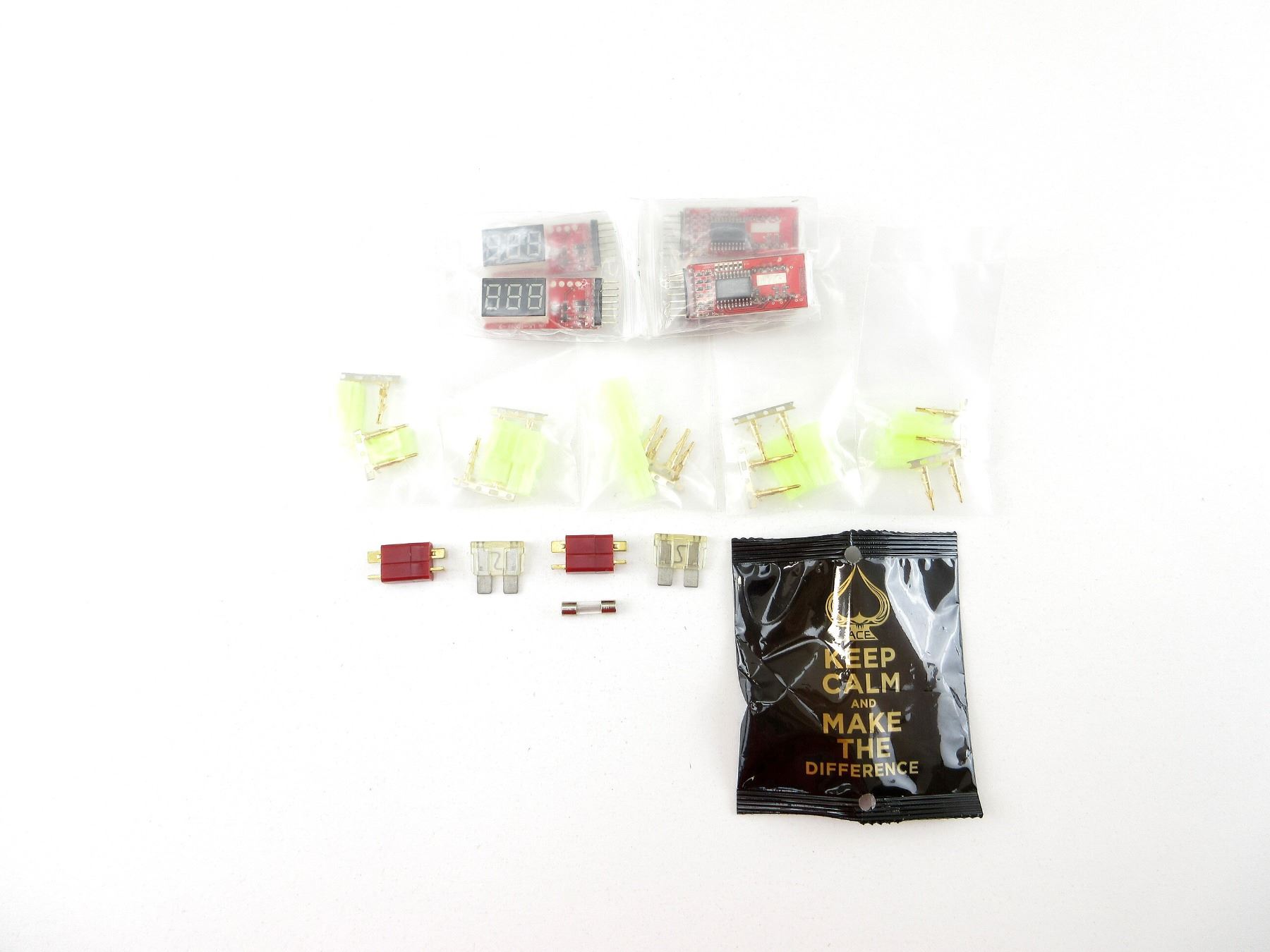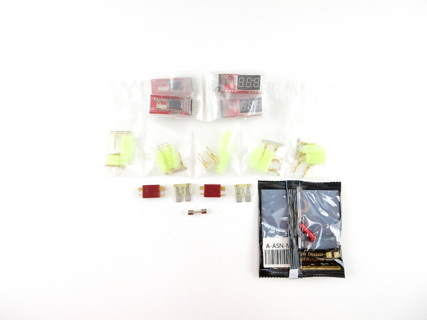 LOT INCLUDES; (5) LI-PO VOLTAGE METERS, SHOWS VOLTAGE OF EACH CELL FOR 2-6 CELL LI-PO BATTERIES & OVERALL TOTAL VOLTAGE, APPEARS NOS, WITH VARIOUS FUSES, ETC. SEE PHOTOS.