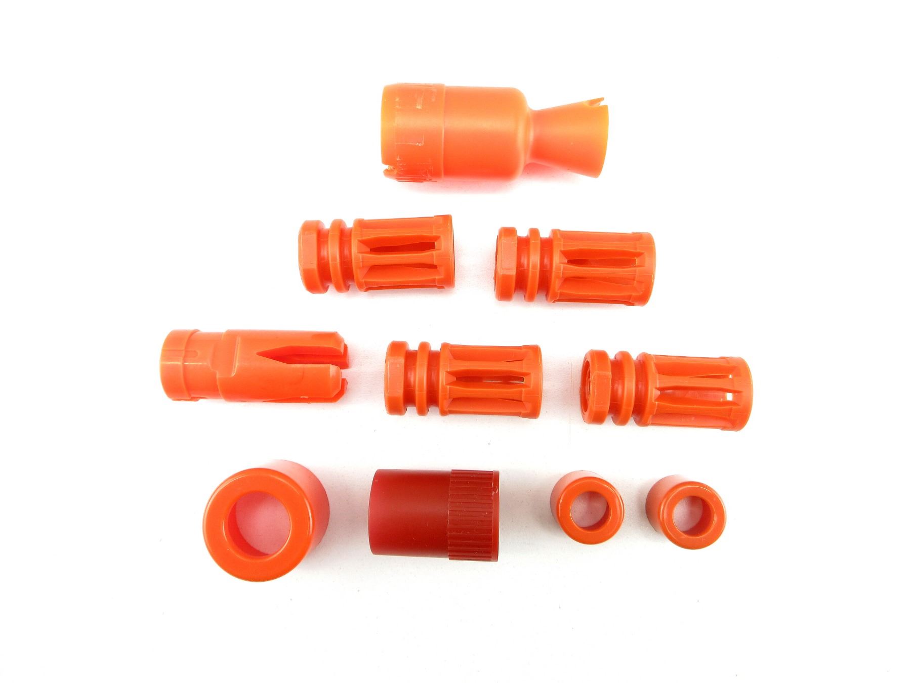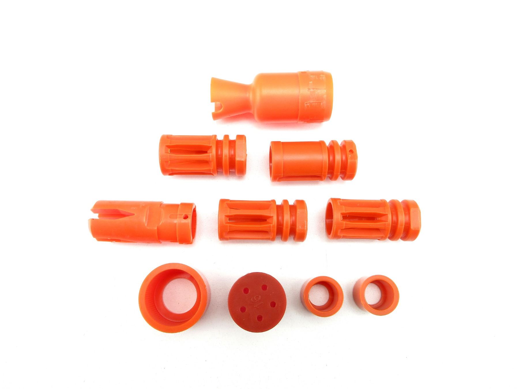 LOT INCLUDES; (4) FLASH HIDERS, ORANGE POLYMER CONSTRUCTION, FITS M16 STYLE AIRSOFT RIFLES, (1) FLASH HIDER, ORANGE POLYMER CONSTRUCTION, FITS AK STYLE AIRSOFT RIFLES, WITH VARIOUS OTHER ORANGE POLYMER FLASH HIDERS. SEE PHOTOS.