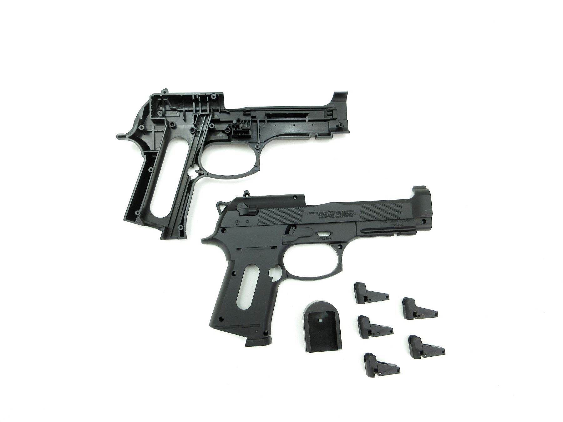 LOT INCLUDES; (1) AIRSOFT PISTOL FRAME, BLACK POLYMER CONSTRUCTION, TWO PIECE, FITS BERETTA 92 AIRSOFT PISTOL MODELS, (1) SKELETON SIDEARMS MAG BOTTOM CAP, BLACK POLYMER CONSTRUCTION, FOR HI-CAP MAGS, (5) UNKNOWN AIRSOFT PISTOL MAGAZINE FEED LIPS, BLACK POLYMER CONSTRUCTION. SEE PHOTOS.