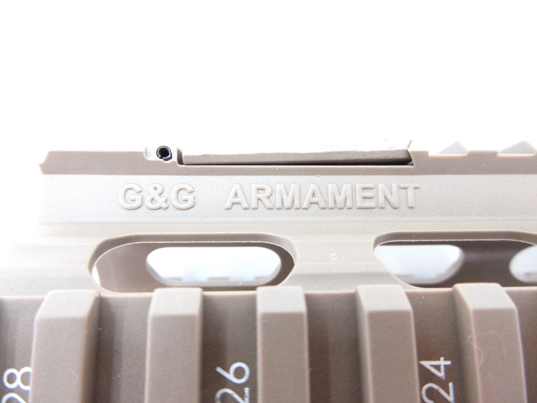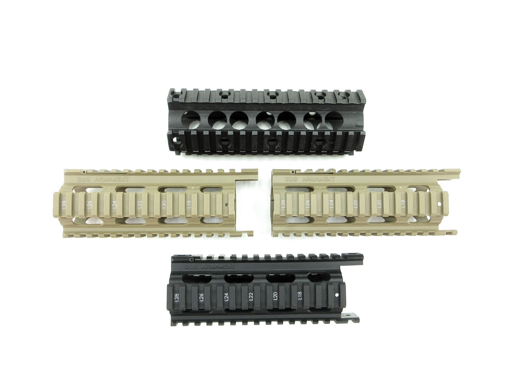 LOT INCLUDES; (2) TAN HAND GUARDS, POLYMER CONSTRUCTION, MARKED: "G&G ARMAMENT", OAL APPROX. 6.5", (1) BLACK HAND GUARD, POLYMER CONSTRUCTION, MARKED: "G&G ARMAMENT", OAL APPROX. 6.5", (1) BLACK HAND GUARD, ALUMINUM CONSTRUCTION, UNMARKED, OAL APPROX. 6.5". SEE PHOTOS.