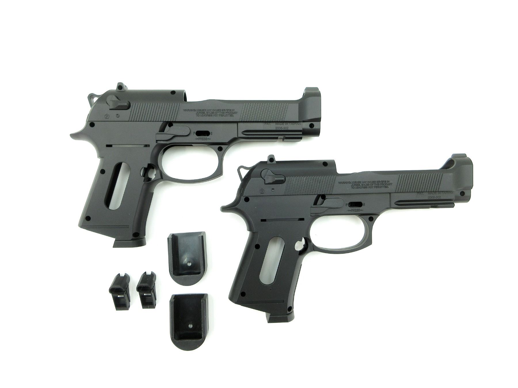 LOT INCLUDES; (2) AIRSOFT PISTOL FRAME, BLACK POLYMER CONSTRUCTION, TWO PIECE, FITS BERETTA 92 AIRSOFT PISTOL MODELS, (2) SKELETON SIDEARMS MAG BOTTOM CAP, FOR HI-CAP MAGS, (2) UNKNOWN FEED LIPS. SEE PHOTOS.