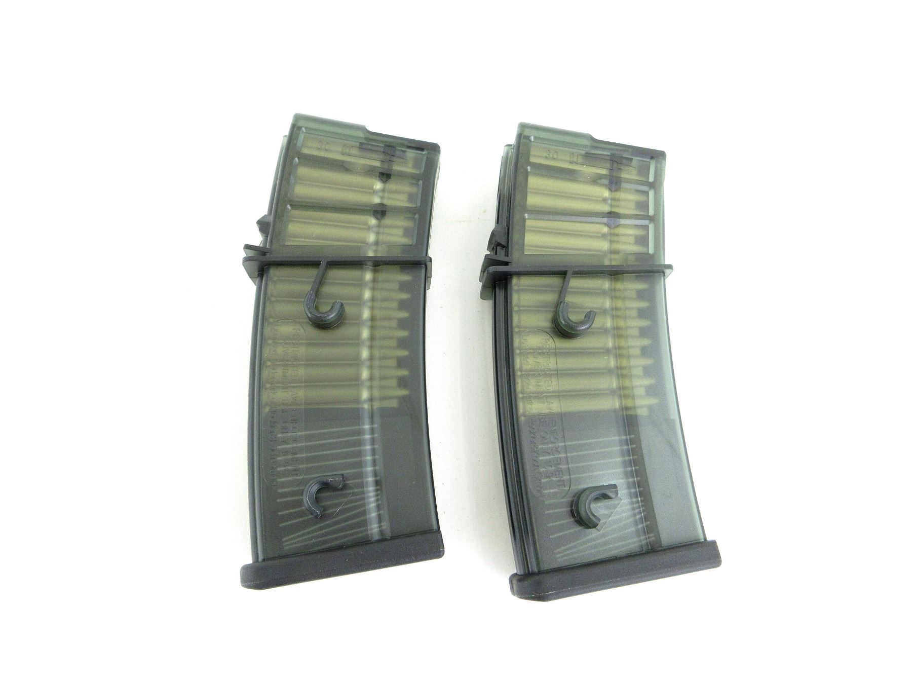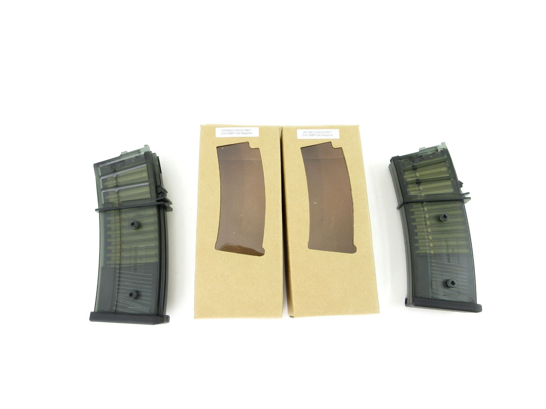 LOT INCLUDES; (2) 6MM PLASTIC BB, 30 ROUND MAGAZINE, ALLOY & POLYMER CONSTRUCTION, WITH DUMMY BULLET-SHAPED INTERNAL STRUCTURE, COMPATIBLE WITH VFC / UMAREX G36 V1 GBB SERIES AIRSOFT RIFLES, APPEARS NOS, WITH ORIGINAL PACKAGING. SEE PHOTOS.