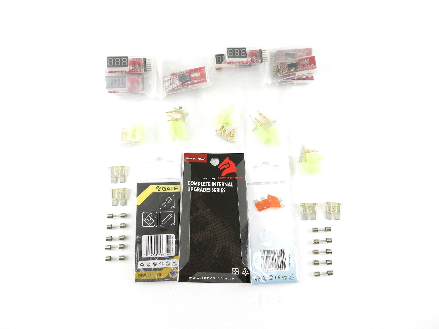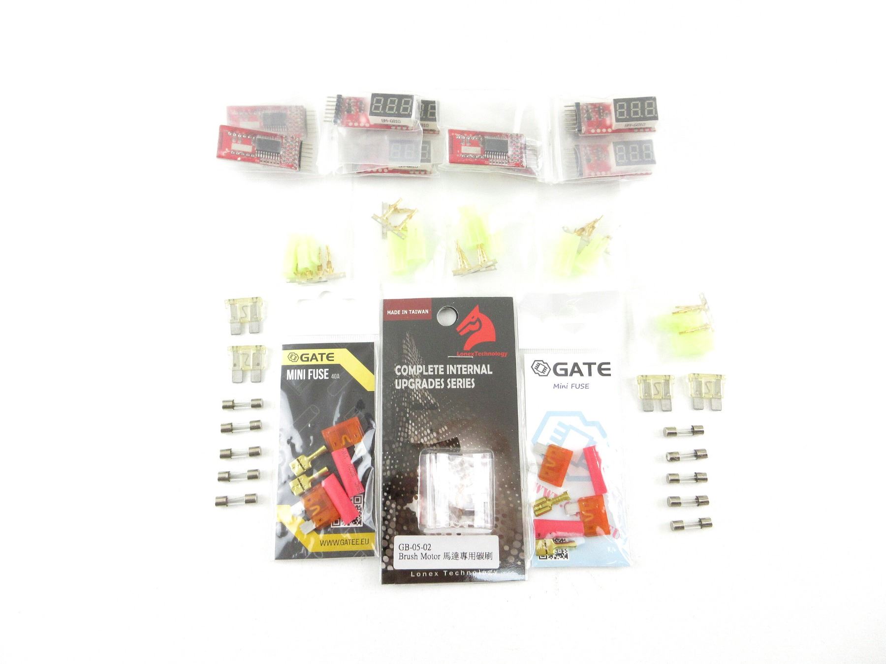 LOT INCLUDES; (2) GATE MINI FUSE 40A, NOS, UNOPENED, (10) LI-PO VOLTAGE METERS, SHOWS VOLTAGE OF EACH CELL FOR 2-6 CELL LI-PO BATTERIES & OVERALL TOTAL VOLTAGE, APPEARS NOS, (1) LONEX GB-05-02 BRUSH MOTOR, NOS, (10) FUSES, ETC. SEE PHOTOS.