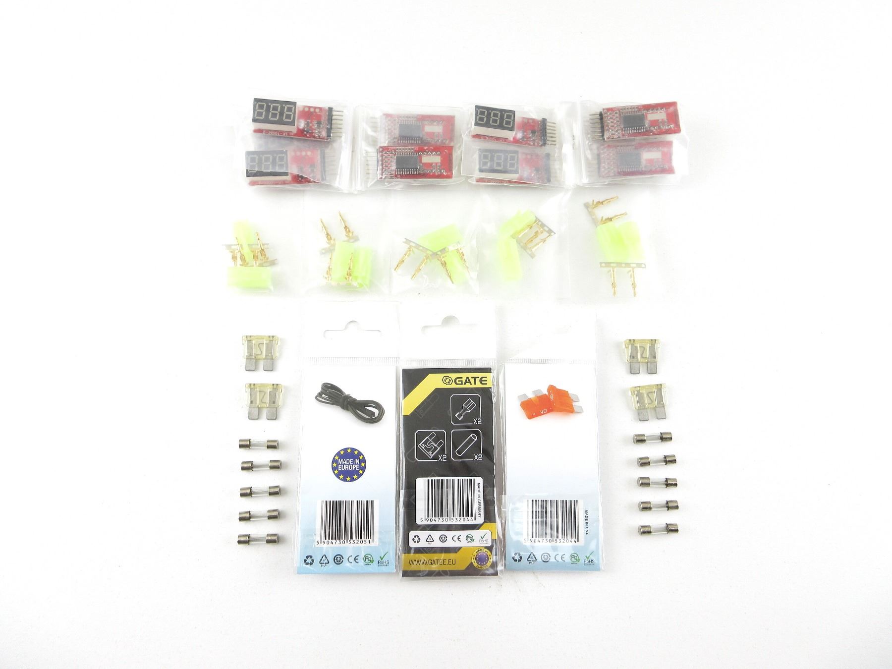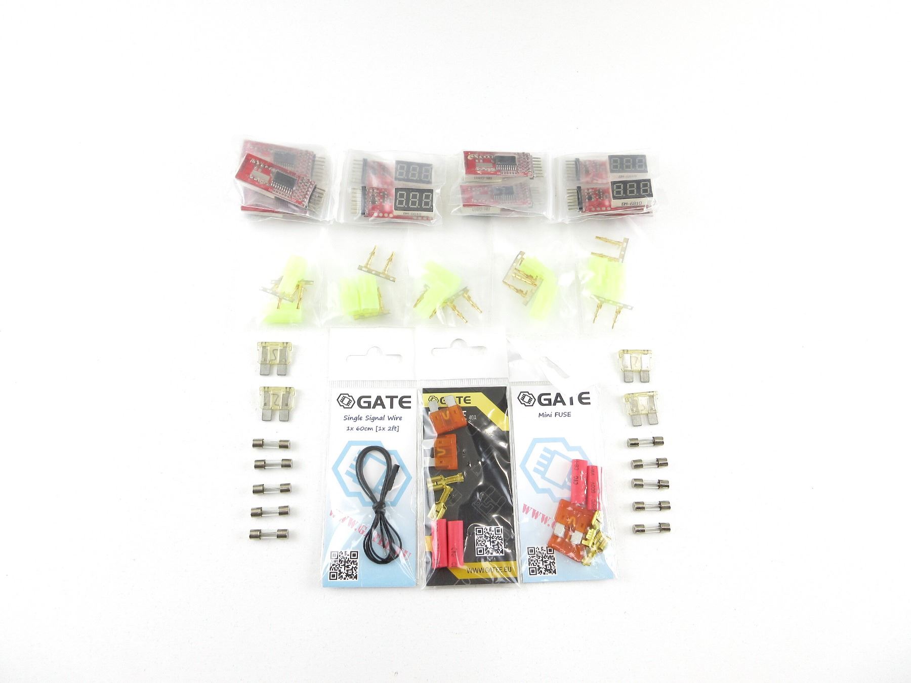 LOT INCLUDES; (2) GATE MINI FUSE 40A, NOS, UNOPENED, (10) LI-PO VOLTAGE METERS, SHOWS VOLTAGE OF EACH CELL FOR 2-6 CELL LI-PO BATTERIES & OVERALL TOTAL VOLTAGE, APPEARS NOS, (1) GATE SINGLE SIGNAL WIRE, 1 X 60CM, NOS, UNOPENED, (10) FUSES, ETC. SEE PHOTOS.