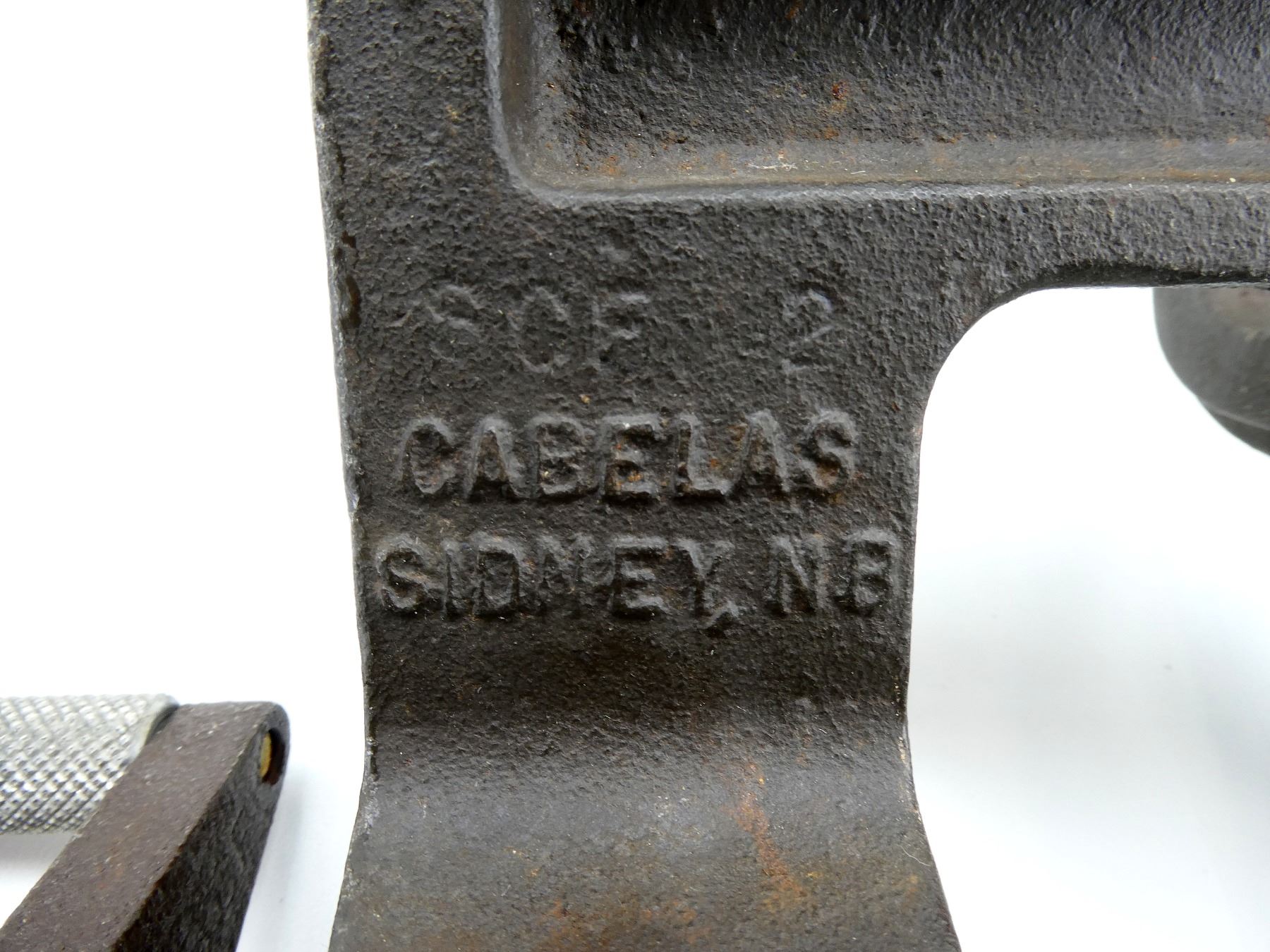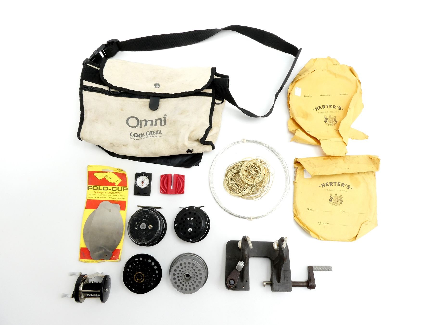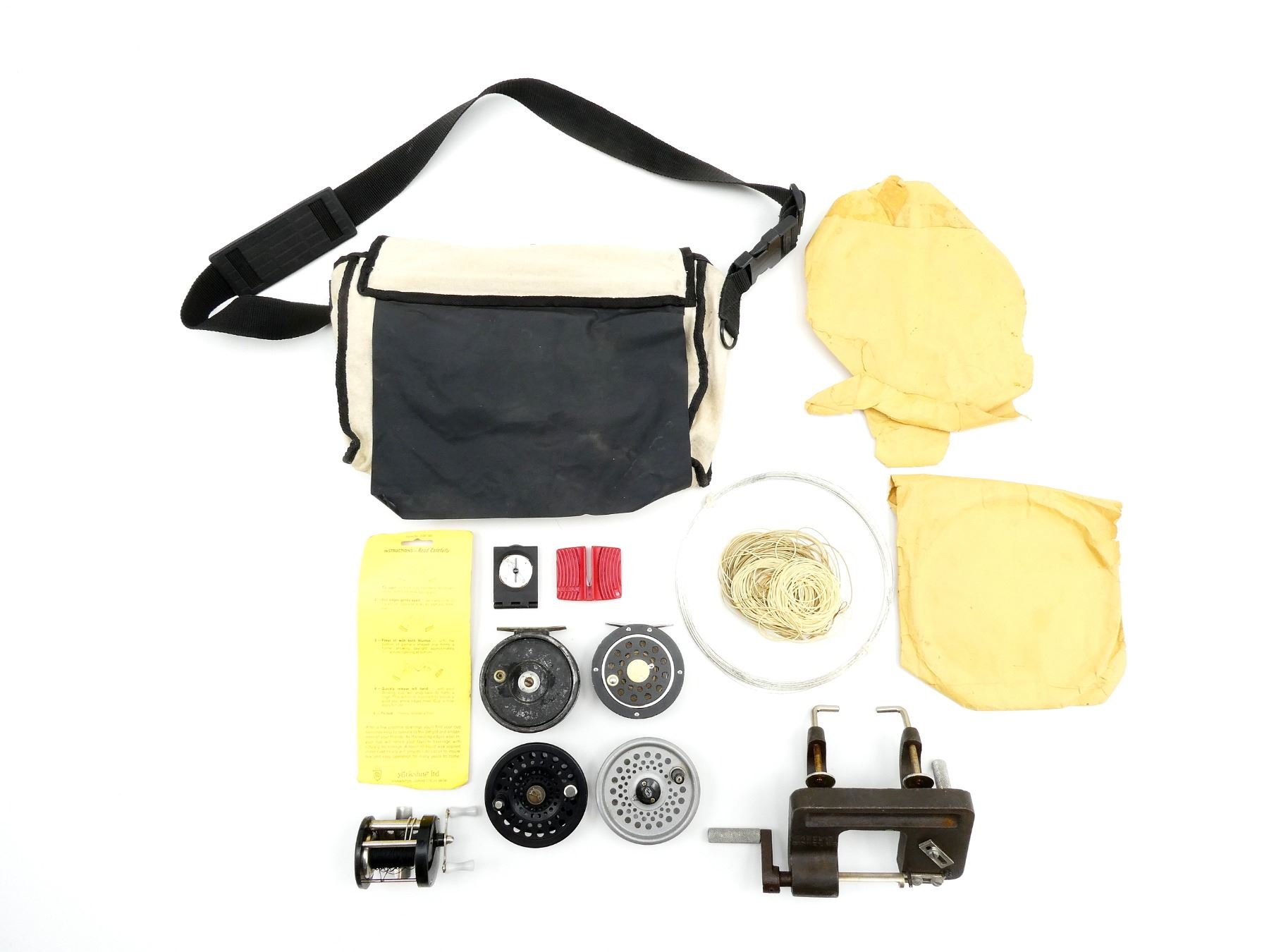 LOT INCLUDES; (1) OMNI COOL CREEL SHOULDER SATCHEL, (5) FISHING REELS, VARIOUS MAKERS, UNTESTED, (1) ROLL OF FLY FISHING LINE, (2) HERTER'S ROLLS OF TWINE, (1) RAPALA KNIFE SHARPENER WITH CERAMIC STICKS, (1) FOLD-CUP PACKET, (1) COMPASS, APPROX. 2.25" X 1.5" & (1) CAST IRON BENCH VISE MADE BY CABELAS, APPROX. 5.25" X 4" X 4.5". SEE PHOTOS.
