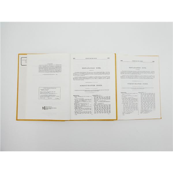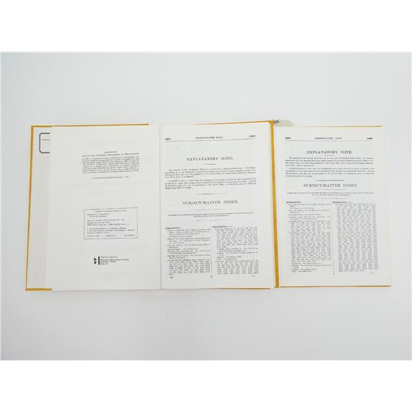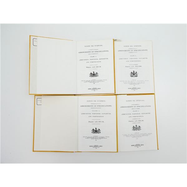 LOT INCLUDES; (1) "PATENTS FOR INVENTIONS, ABRIDGMENTS OF SPECIFICATIONS, CLASS 9, AMMUNITION, 1855-66" BOOK, VOLUME 1, NO. 12 / 550 COPIES, HARD COVER, ISBN: 0-919316-77-8, (1) "PATENTS FOR INVENTIONS, ABRIDGMENTS OF SPECIFICATIONS, CLASS 9, AMMUNITION, 1867-76" BOOK, VOLUME 2, NO. 12 / 550 COPIES, HARD COVER, ISBN: 0-919316-78-6, (1) "PATENTS FOR INVENTIONS, ABRIDGMENTS OF SPECIFICATIONS, CLASS 9, AMMUNITION, 1867-76" BOOK, VOLUME 3, NO. 12 / 550 COPIES, HARD COVER, ISBN: 0-919316-79-4 & (1) "PATENTS FOR INVENTIONS, ABRIDGMENTS OF SPECIFICATIONS, CLASS 9, AMMUNITION, 1884-88" BOOK, VOLUME 4, NO. 12 / 550 COPIES, HARD COVER, ISBN: 0-919316-80-8. SEE PHOTOS.