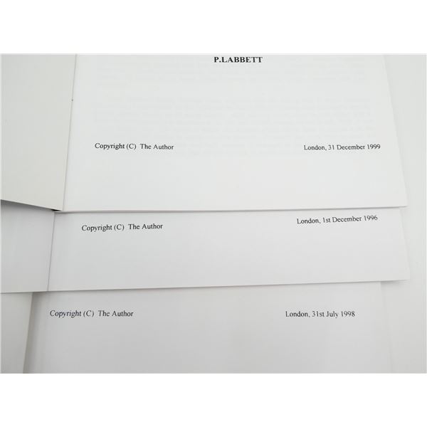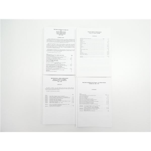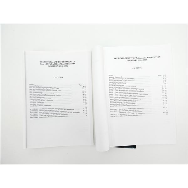 LOT INCLUDES; (1) "THE DEVELOPMENT OF 5.56MM X 45 AMMUNITION IN BRITAIN 1966-1997" BOOK BY P. LABBETT, SOFT COVER, COPYRIGHT 1997, (1) "ASSAULT RIFLE AMMUNITION 5.6MM TO 11MM CALIBRE" BOOK BY P. LABBETT, SOFT COVER, COPYRIGHT 2000, (1) "THE HISTORY & DEVELOPMENT OF 9MM X 19 PARABELLUM AMMUNITION IN BRITAIN 1919-1996" BOOK BY P. LABBETT, COPYRIGHT 1996, (1) "RADWAY GREEN, A HISTORY OF ROYAL ORDNANCE FACTORY RADWAY GREEN & ROYAL ORDNANCE PLC, RADWAY GREEN 1940-1999" BOOK BY P. LABBETT, SOFT COVER, COPYRIGHT 1999, (1) "BRITISH SMALL ARMS AMMUNITION MISCELLANEOUS CALIBRES EXPERIMENTAL & SERVICE 1939-1999" BOOK BY P. LABBETT, SOFT COVER, COPYRIGHT 1999, (1) "THE DEVELOPMENT OF 7.62MM X 51 AMMUNITION IN BRITAIN 1953-1997" BOOK BY P. LABBETT, SOFT COVER, COPYRIGHT 1998 & (1) "THE DEVELOPMENT IN BRITAIN OF .30 INCH AMMUNITION, 7.92MM AMMUNITION, 15MM BESA AMMUNITION 1939-1993" BOOK BY P. LABBETT, SOFT COVER, COPYRIGHT 1999. SEE PHOTOS.