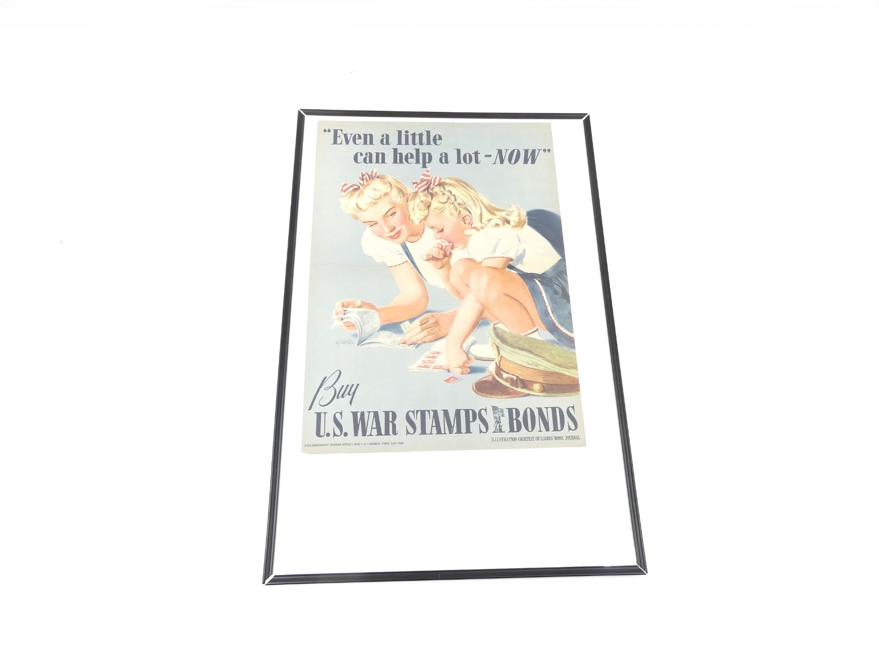 (1) FRAMED WAR BONDS POSTER, MARKED: "EVEN A LITTLE CAN HELP A LOT - NOW, BUY WAR STAMPS BONDS" & "U.S. GOVERNMENT PRINTING OFFICE: 1942" ETC., PLASTIC FRAME & COVER, CRACK AT TOP MIDDLE OF COVER, APPROX. 26.75" X 17 7/8". SEE PHOTOS.