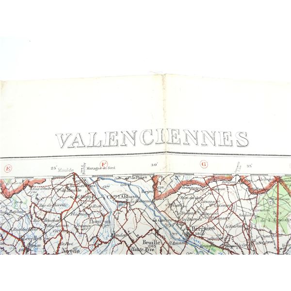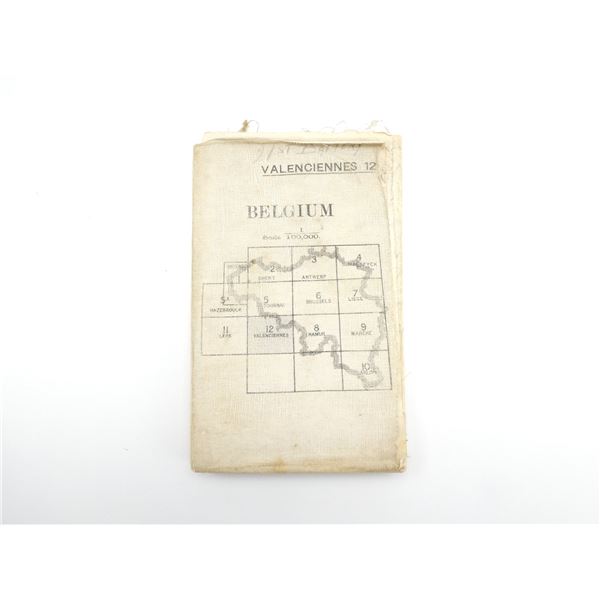 (1) 1915 MAP OF VALENCIENNES, BELGIUM, MARKED: "BELGIUM 1:100, 000, VALENCIENNES" & "GEOGRAPHICAL SECTION, GENERAL STAFF, NO. 2364, WAR OFFICE, MAY 1915" & VARIOUS OTHER MARKINGS, HAND-WRITTEN MARKING: "21ST BATTERY", COLOURED MAP, SCALE 1:100, 000 OR 1" TO 1.58 MILES, APPROX. 33 3/8" X 27.75". SEE PHOTOS.