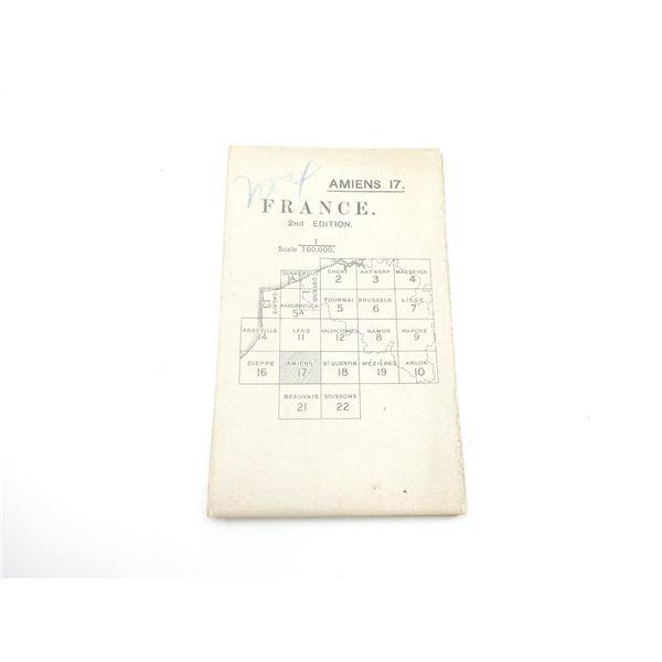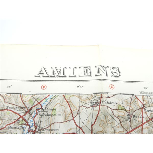 (1) 1915 / 1916 MAP OF AMIENS, FRANCE, MARKED: "FRANCE 1:100,000, AMIENS, EDITION 2" & "GEOGRAPHICAL SECTION, GENERAL STAFF, NO. 2364, WAR OFFICE, OCTOBER 1915, ORDNANCE SURVEY 1916" & VARIOUS OTHER MARKINGS, COLOURED MAP, SCALE 1:100, 000 OR 1" TO 1.58 MILES, APPROX. 33 5/8" X 28". SEE PHOTOS.