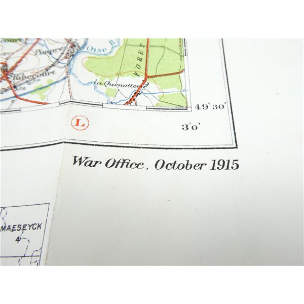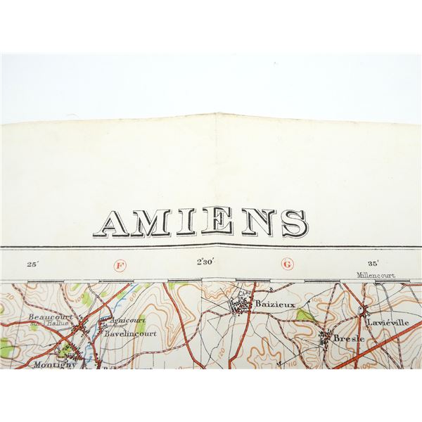 (1) 1915 MAP OF AMIENS, FRANCE, MARKED: "FRANCE 1:100,000, AMIENS" & "GEOGRAPHICAL SECTION, GENERAL STAFF, NO. 2364, WAR OFFICE, OCTOBER 1915" & VARIOUS OTHER MARKINGS, COLOURED MAP, SCALE 1:100, 000 OR 1" TO 1.58 MILES, APPROX. 34" X 27 7/8". SEE PHOTOS.