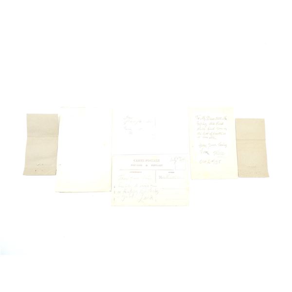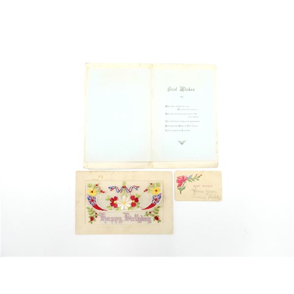 LOT INCLUDES; (2) WWII CANADIAN ARMY MATCH BOOKS, ONE FEATURES AN ANTI-AIRCRAFT MACHINE GUN, OTHER FEATURES A TOMMY GUN MOTOR CYCLIST & (4) "SWEETHEART" CARDS, DECORATIVE HAND-EMBROIDERED DESIGNS ON CARDBOARD, VARIOUS MESSAGES INSIDE / ON BACKS, COUPLE DATED 1915, 1916. SEE PHOTOS.