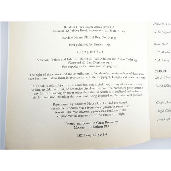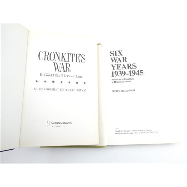 LOT INCLUDES; (1) "THE FORGOTTEN DEAD" BOOK BY KEN SMALL, HARD COVER WITH DUST COVER, ISBN: 0-7475-4467-0, (1) "THE FORGOTTEN HIGHLANDER, MY INCREDIBLE STORY OF SURVIVAL DURING THE WAR IN THE FAR EAST" BOOK BY ALISTAIR URQUHART, HARD COVER WITH DUST COVER, ISBN: 978-1-4087-0211-6, (1) "SIX WAR YEARS 1939-1945 MEMORIES OF CANADIANS AT HOME AND ABROAD" BOOK BY BARRY BROADFOOT, HARD COVER WITH DUST COVER, ISBN: 0-385-05814-4, (1) "BODYGUARD OF LIES" BOOK BY ANTHONY CAVE BROWN, SOFT COVER, ISBN: 0-553-01311-4, (1) "SIX WAR YEARS 1939-1945, MEMORIES OF CANADIANS AT HOME AND ABROAD" BOOK BY BARRY BROADFOOT, HARD COVER, ISBN: 0-385-05814-4, (1) "A COMPANY OF HEROES" BOOK BY MARCUS BROTHERTON, HARD COVER WITH DUST COVER, ISBN: 978-0-425-23420-4, (1) "TIME TO KILL THE SOLDIER'S EXPERIENCE OF WAR IN THE WEST 1939-1945" BOOK EDITED BY PAUL ADDISON & ANGUS CALDER, SOFT COVER, ISBN: 0-7126-7376-8 & (1) "CRONKITE'S WAR" BOOK BY WALTER CRONKITE IV & MAURICE ISSERMAN, HARD COVER, ISBN: 978-1-4262-1019-8. SEE PHOTOS.