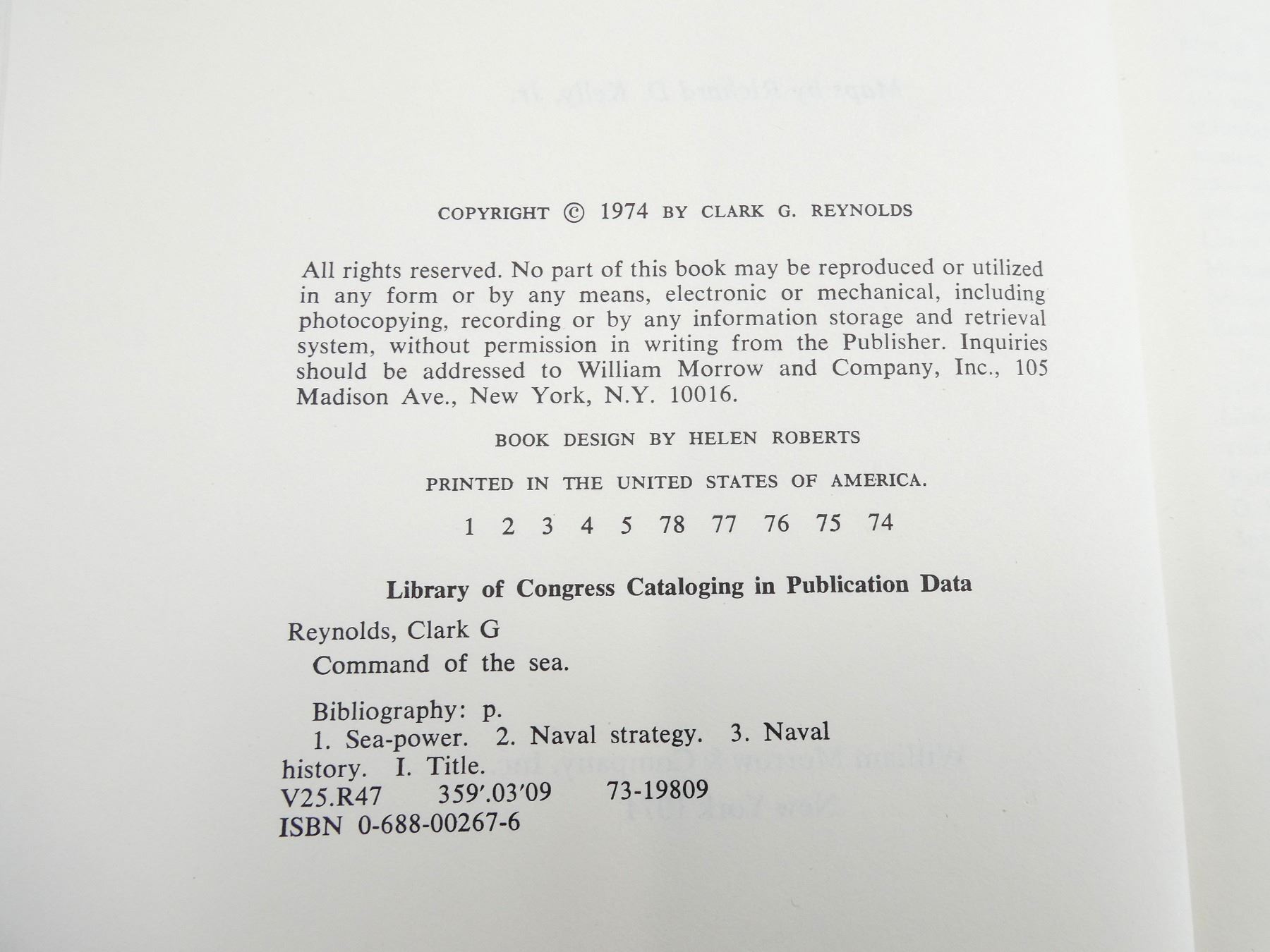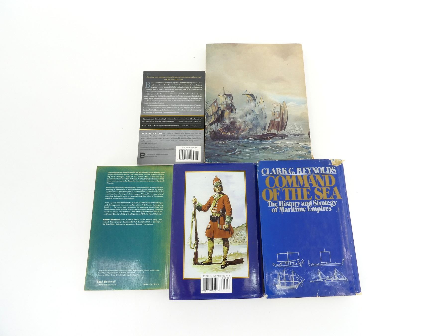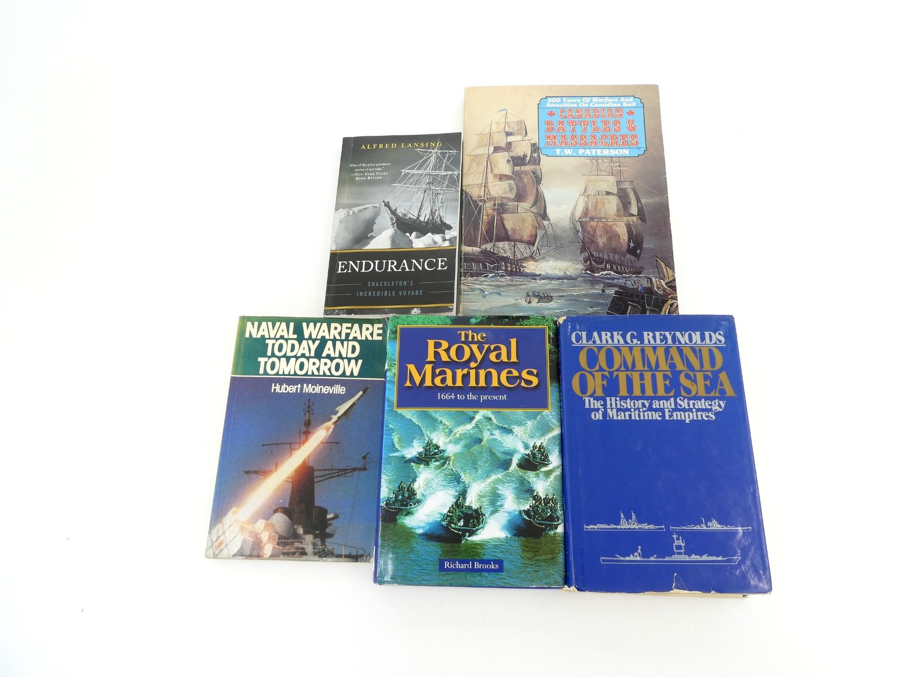 LOT INCLUDES; (1) "COMMAND OF THE SEA, THE HISTORY AND STRATEGY OF MARITIME EMPIRES" BOOK BY CLARK G. REYNOLDS, HARD COVER WITH DUST COVER, ISBN: 0-688-00267-6, (1) "NAVAL WARFARE TODAY AND TOMORROW" BOOK BY HUBERT MOINEVILLE, SOFT COVER, ISBN: 0-631-13291-0, (1) "THE ROYAL MARINES, 1664 TO THE PRESENT" BOOK BY RICHARD BROOKS, HARD COVER WITH DUST COVER, ISBN: 1-55750-007-X, (1) "CANADIAN BATTLES & MASSACRES" BOOK BY T.W. PATERSON, SOFT COVER, COPYRIGHT 1977 & (1) "ENDURANCE, SHACKLETON'S INCREDIBLE VOYAGE" BOOK BY ALFRED LANSING, SOFT COVER, ISBN: 978-0-78670-621-1. SEE PHOTOS.