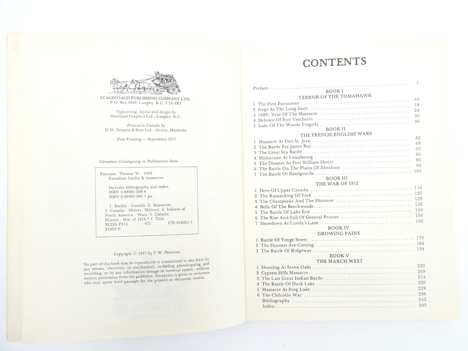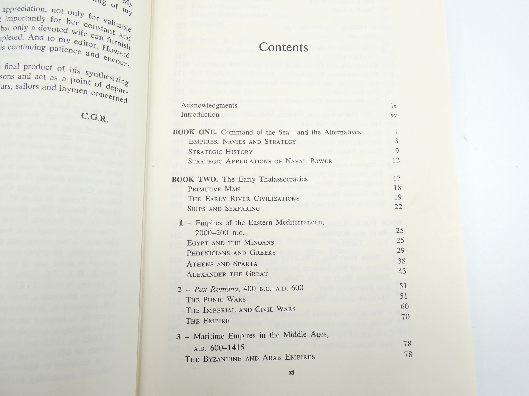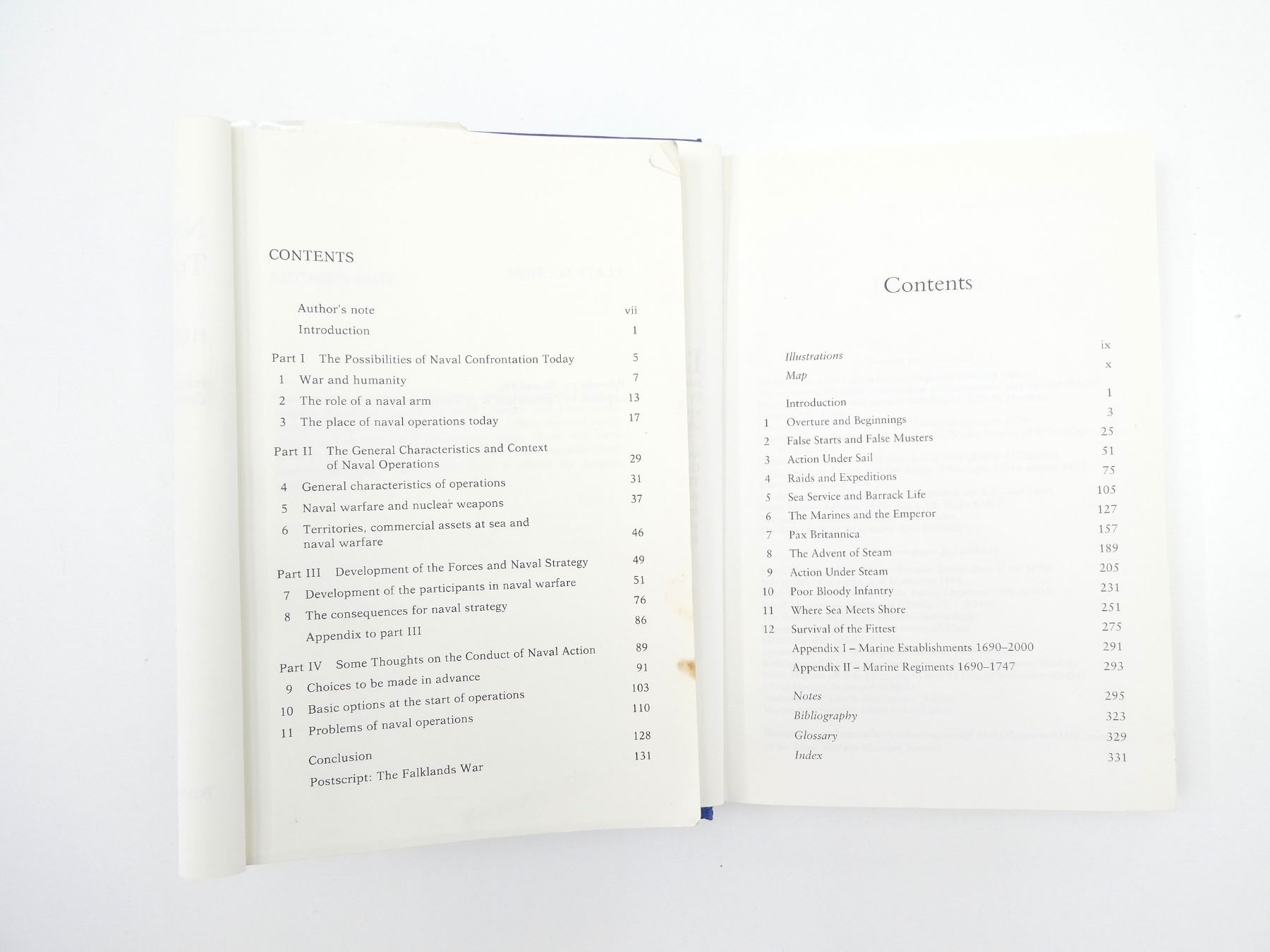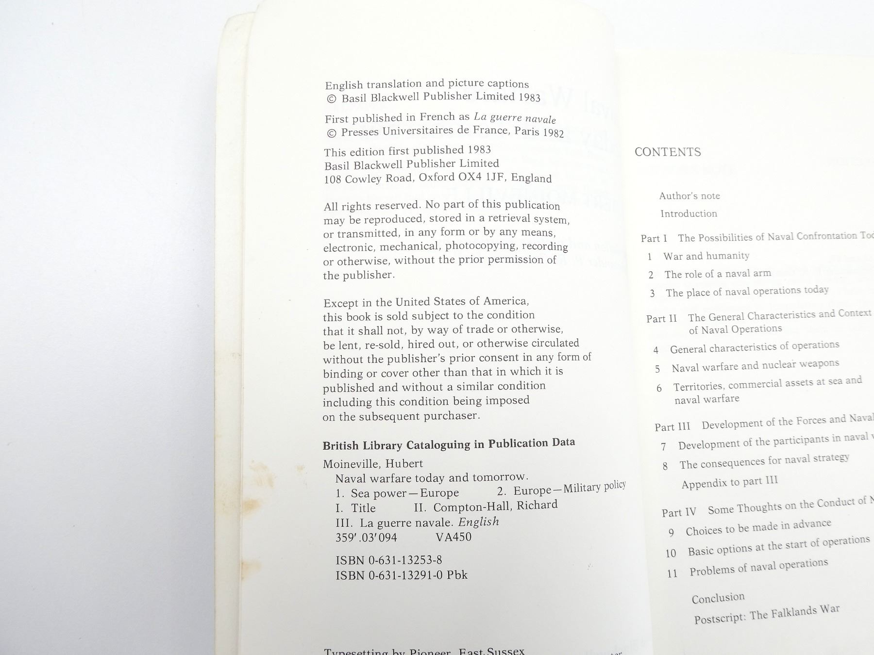 LOT INCLUDES; (1) "COMMAND OF THE SEA, THE HISTORY AND STRATEGY OF MARITIME EMPIRES" BOOK BY CLARK G. REYNOLDS, HARD COVER WITH DUST COVER, ISBN: 0-688-00267-6, (1) "NAVAL WARFARE TODAY AND TOMORROW" BOOK BY HUBERT MOINEVILLE, SOFT COVER, ISBN: 0-631-13291-0, (1) "THE ROYAL MARINES, 1664 TO THE PRESENT" BOOK BY RICHARD BROOKS, HARD COVER WITH DUST COVER, ISBN: 1-55750-007-X, (1) "CANADIAN BATTLES & MASSACRES" BOOK BY T.W. PATERSON, SOFT COVER, COPYRIGHT 1977 & (1) "ENDURANCE, SHACKLETON'S INCREDIBLE VOYAGE" BOOK BY ALFRED LANSING, SOFT COVER, ISBN: 978-0-78670-621-1. SEE PHOTOS.
