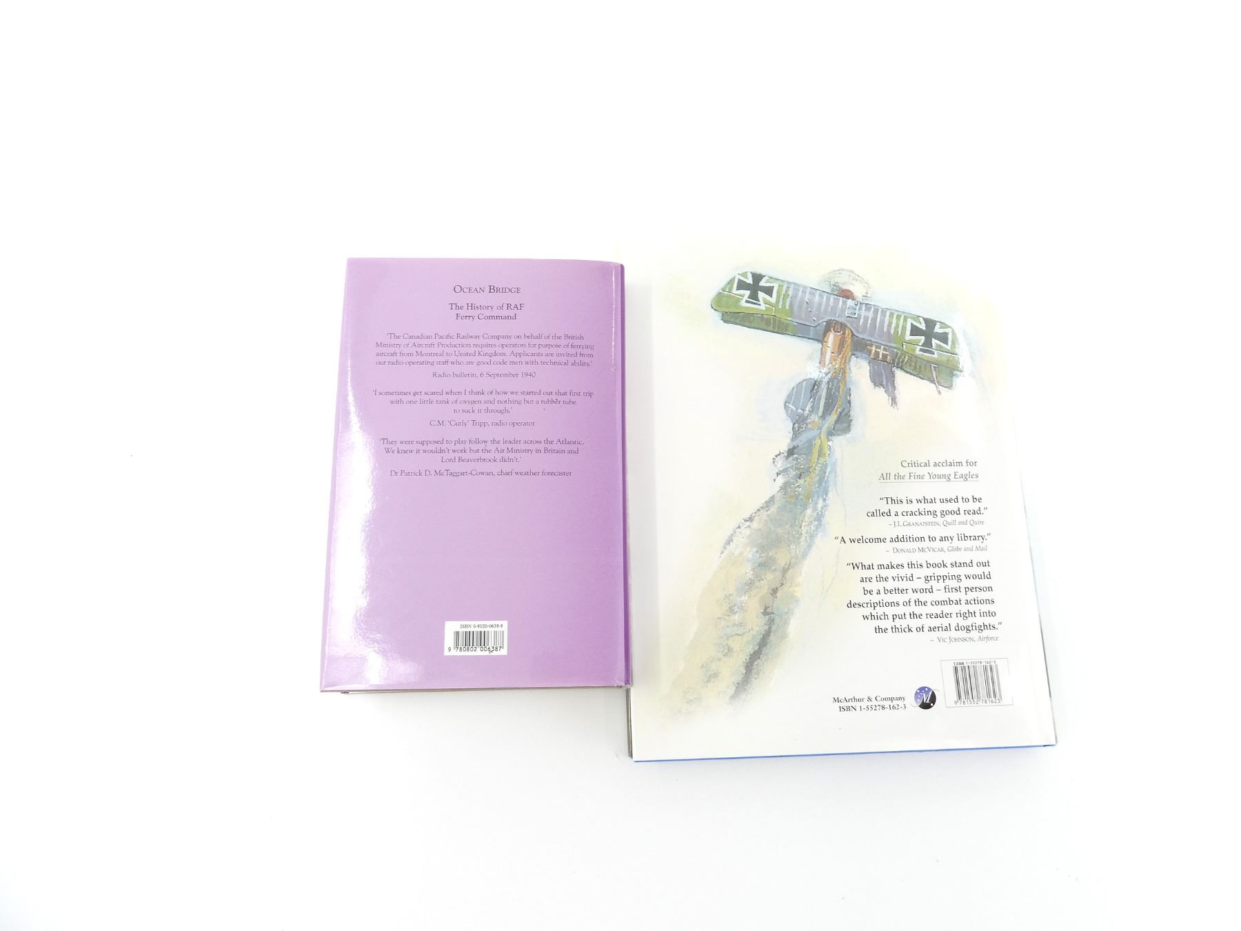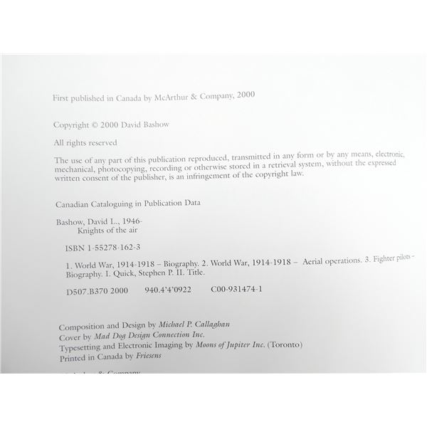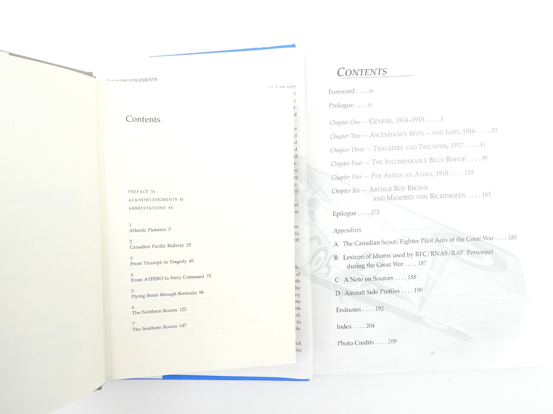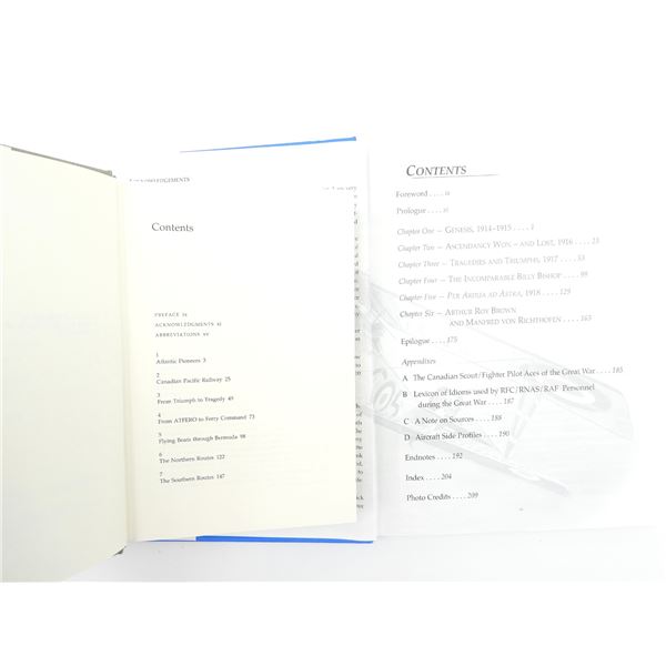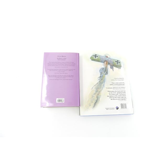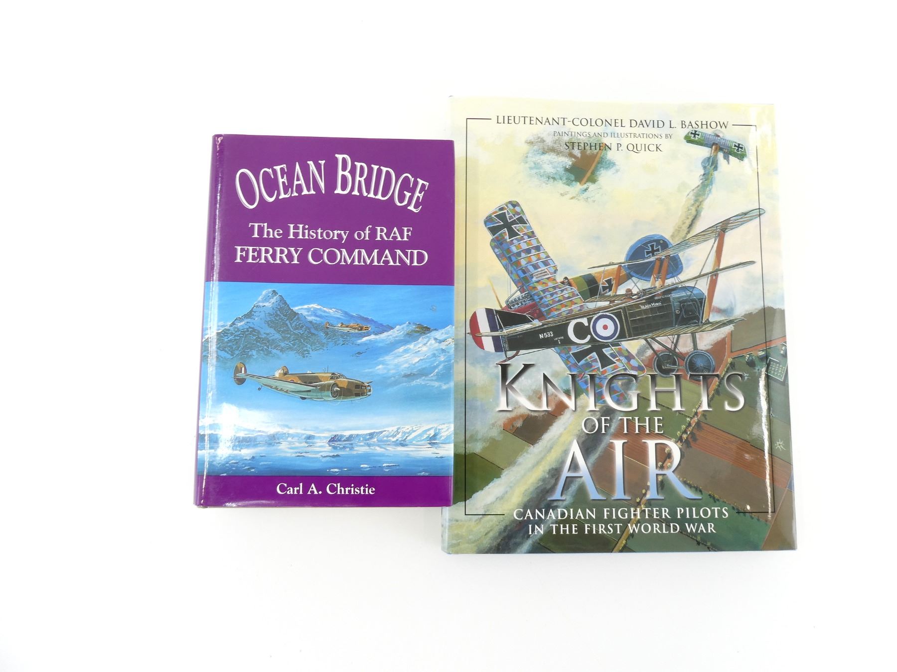 LOT INCLUDES; (1) "KNIGHTS OF THE AIR, CANADIAN FIGHTER PILOTS IN THE FIRST WORLD WAR" BOOK BY DAVID L. BASHOW, HARD COVER WITH DUST COVER, ISBN: 1-55278-162-3 & (1) "OCEAN BRIDGE, THE HISTORY OF RAF, FERRY COMMAND" BOOK BY CARL A. CHRISTIE, HARD COVER WITH DUST COVER, ISBN: 0-8020-0638-8. SEE PHOTOS.
