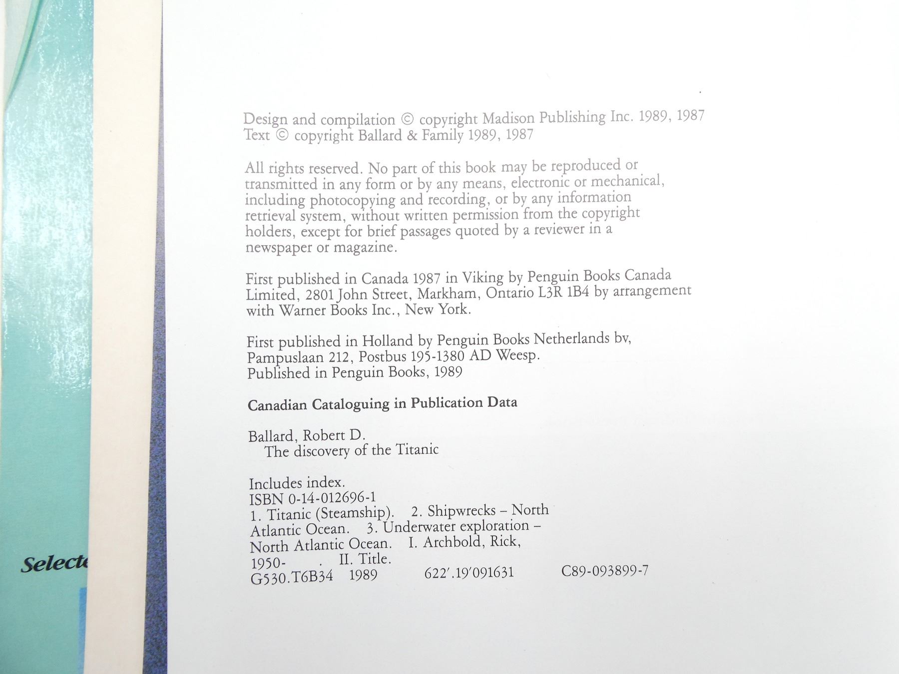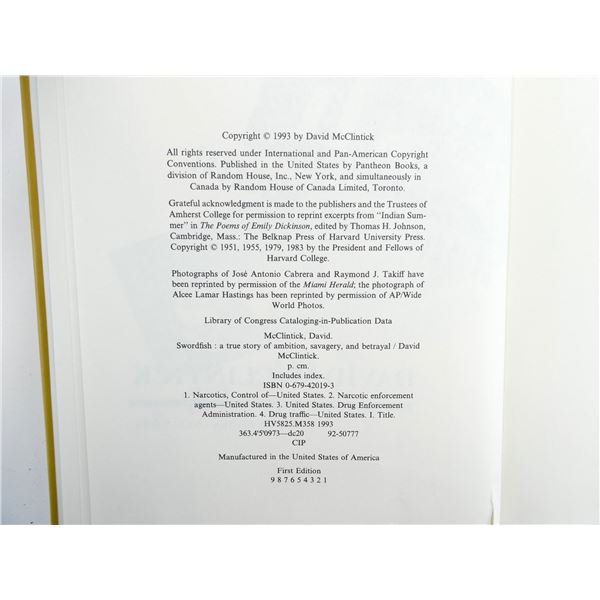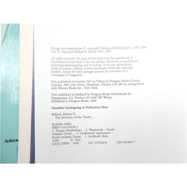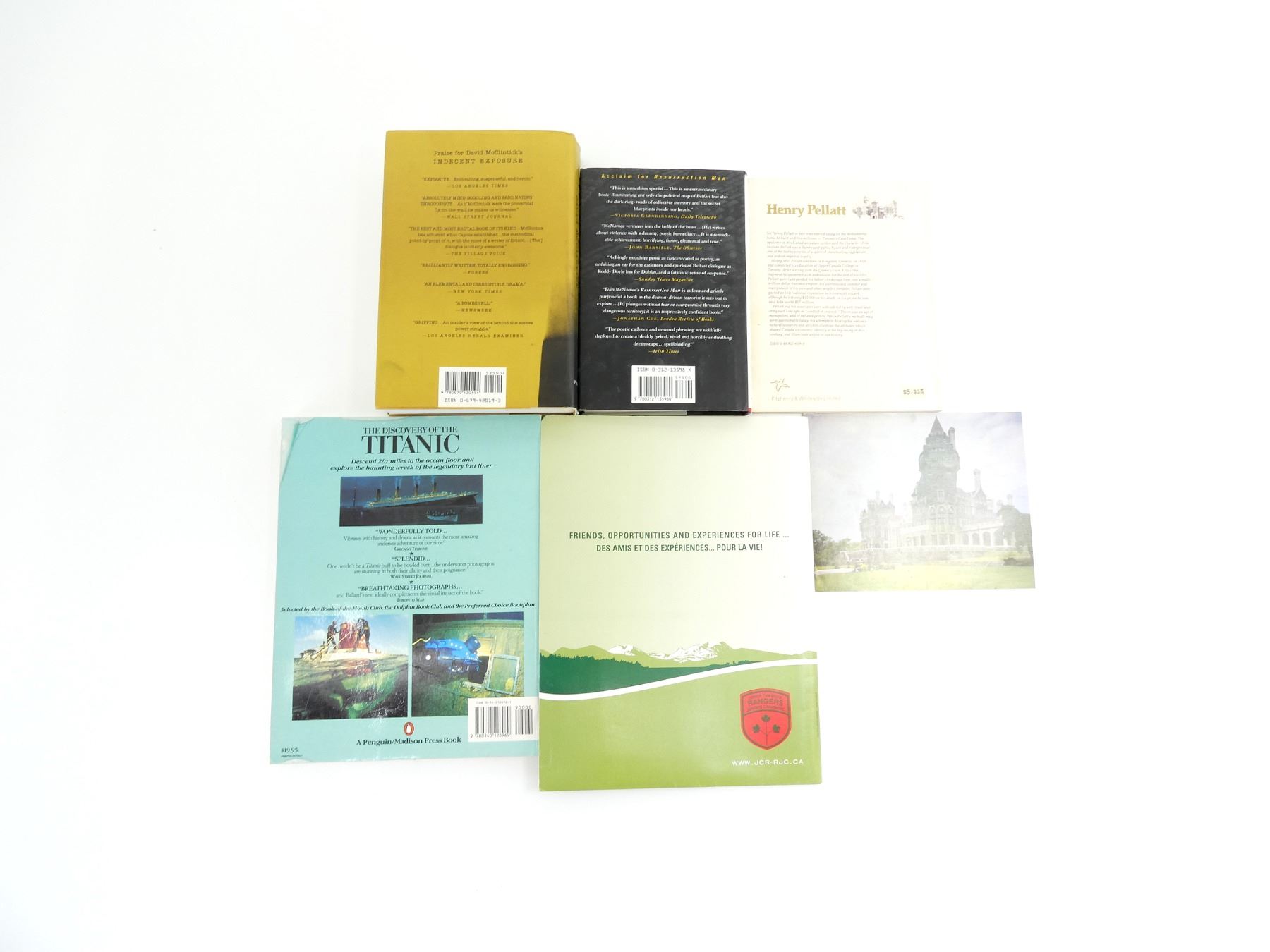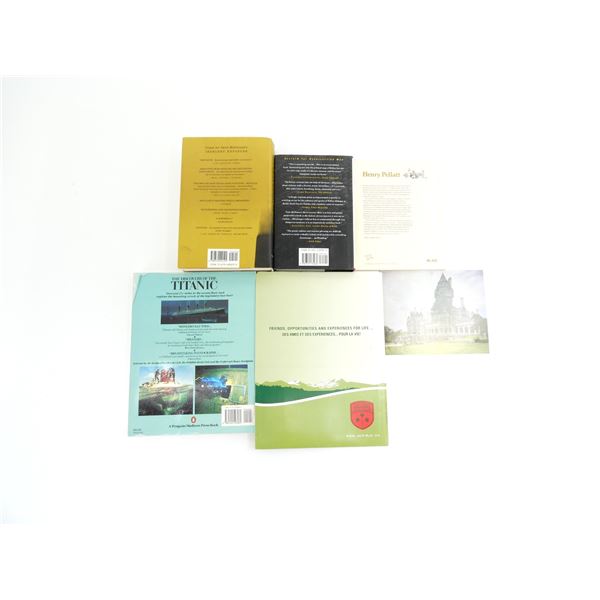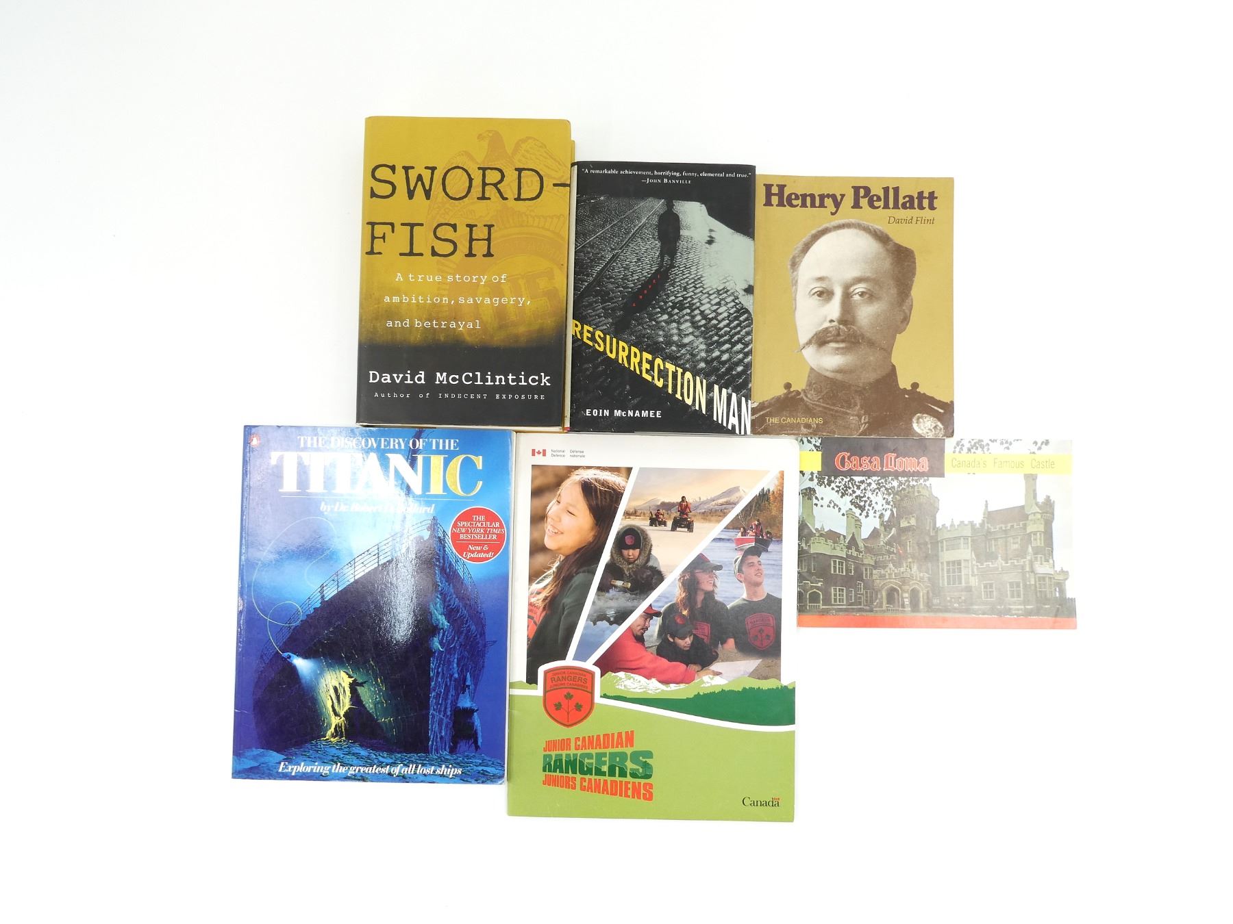 LOT INCLUDES; (1) "SWORDFISH" BOOK BY DAVID MCCLINTICK, HARD COVER WITH DUST COVER, ISBN: 0-679-42019-3, (1) "HENRY PELLATT" BOOK BY DAVID FLINT, SOFT COVER, ISBN: 0-88902-659-9, (1) "CASA LOMA, CANADA'S FAMOUS CASTLE" BOOK, SOFT COVER, (1) "RESURRECTION MAN" BOOK BY EOIN MCNAMEE, HARD COVER WITH DUST COVER, ISBN: 0-312-13598-X, (1) "THE DISCOVERY OF THE TITANIC" BY ROBERT D. BALLARD, SOFT COVER, ISBN: 0-14-012696-1 & (1) "JUNIOR CANADIAN RANGERS 10TH ANNIVERSARY CEREMONY" BULLETIN, SOFT COVER. SEE PHOTOS.