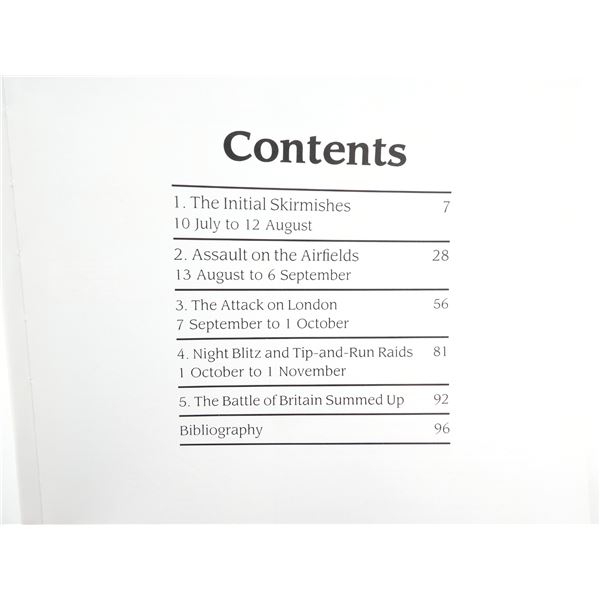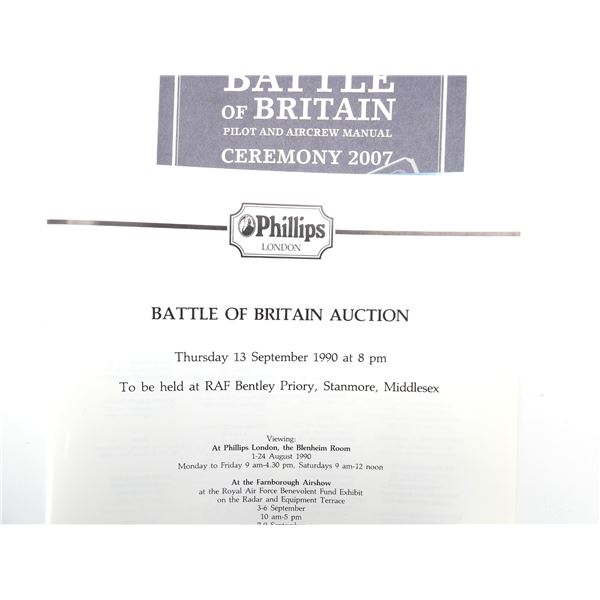 SOFT COVERS, LOT INCLUDES; (1) "BATTLE OF BRITAIN PILOT AND AIRCREW MANUAL, CEREMONY 2007" BOOKLET, (1) "BATTLE OF BRITAIN AUCTION" BOOKLET, (1) "BATTLE OF BRITAIN 50TH ANNIVERSARY" BOOKLET, (1) "BATTLE OF BRITAIN" BOOK BY ALFRED PRICE, ISBN: 0-85079-198-7 & "BATTLE OF BRITAIN" FOLDER. SEE PHOTOS.