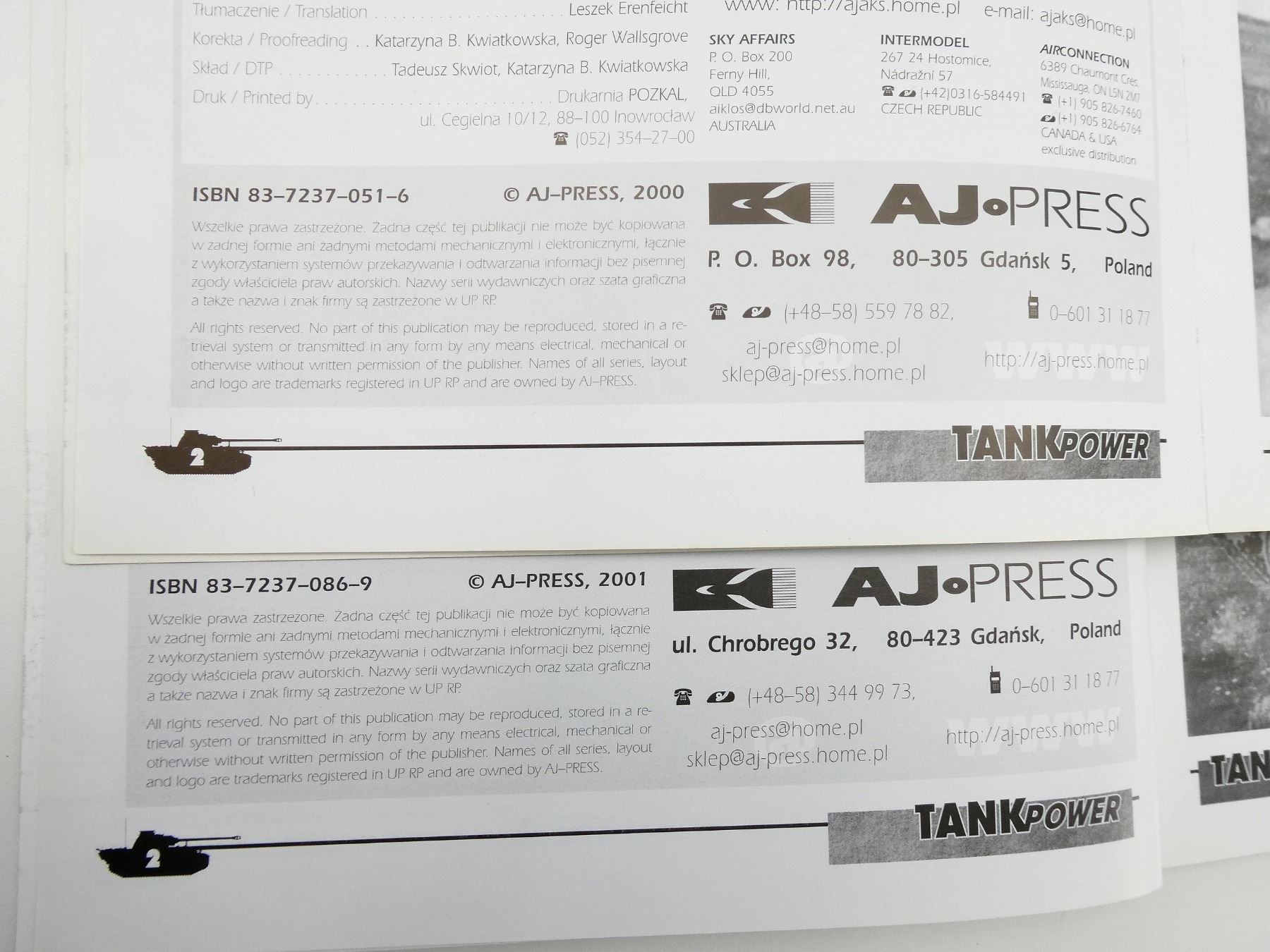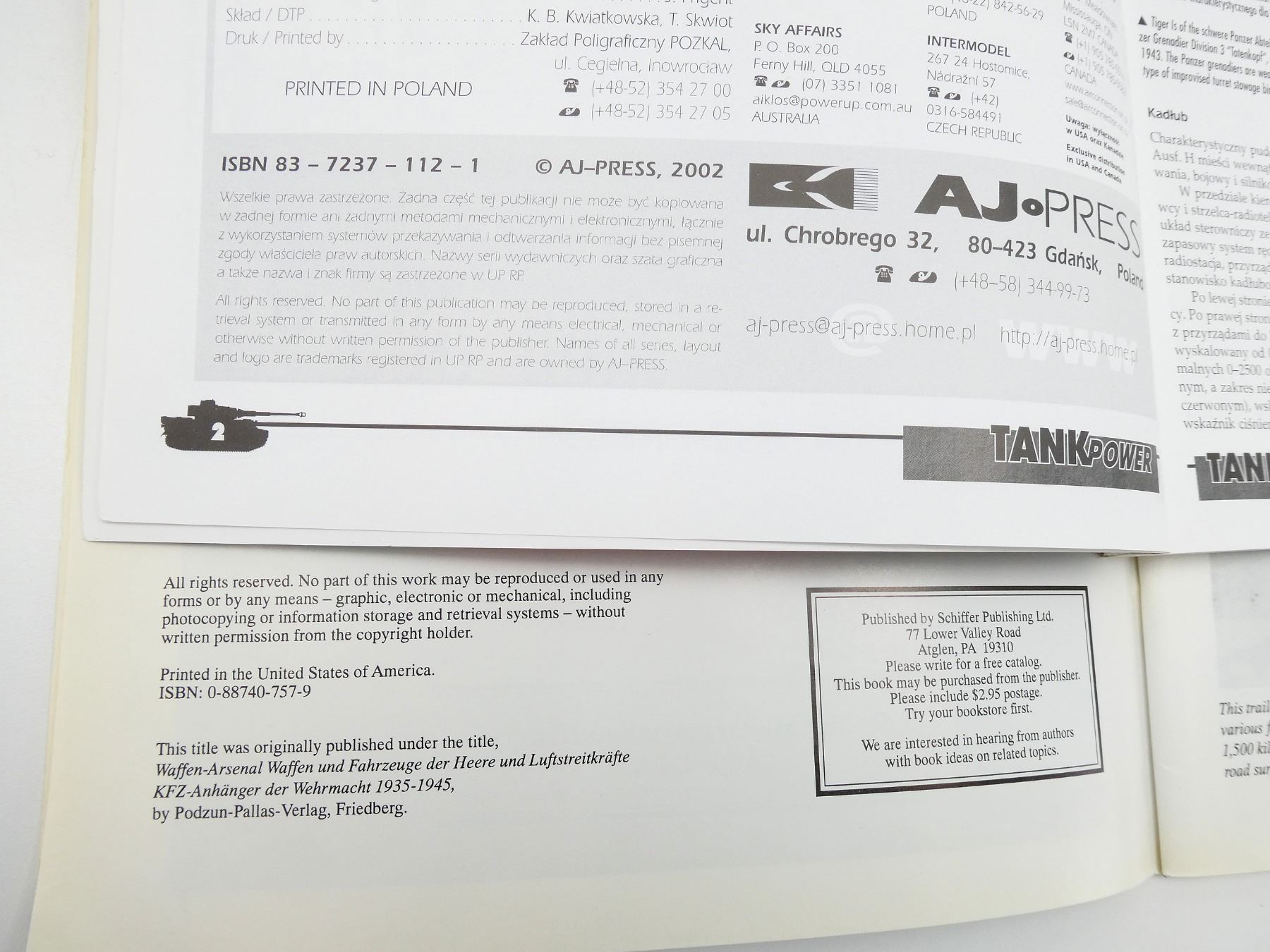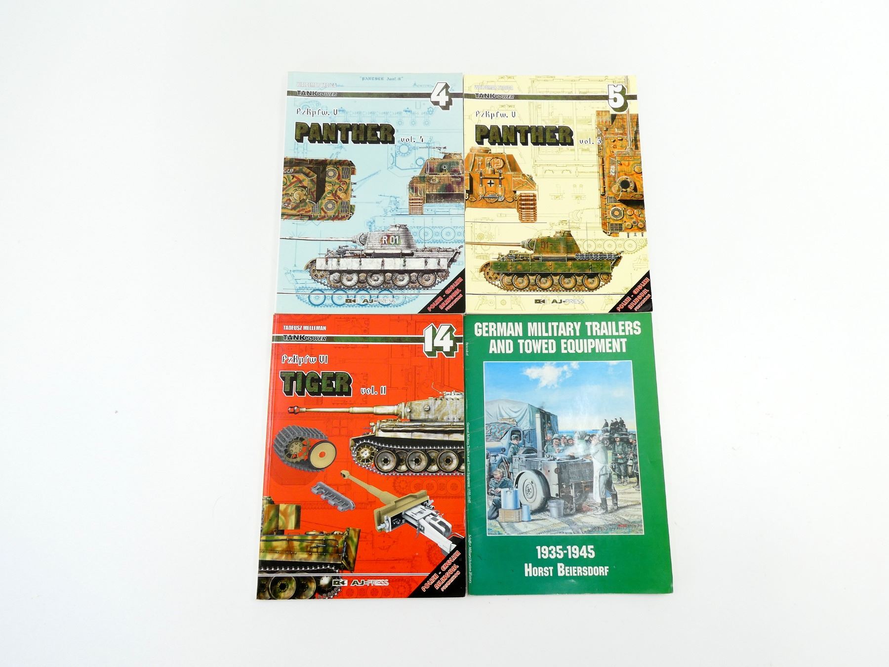 SOFT COVERS, LOT INCLUDES; (1) PZKPFW. VI TIGER VOL. 2" BOOK BY TADEUSZ MELLEMAN, IN POLISH/ENGLISH, ISBN: 83-7237-112-1, (1) PZKPFW. V PANTHER VOL. 4" BOOK BY WALDEMAR TROJCA, IN POLISH/ENGLISH, ISBN: 83-7237-051-6, (1) PZKPFW. V PANTHER VOL. 5" BOOK BY WALDEMAR TROJCA, IN POLISH/ENGLISH, ISBN: 83-7237-086-9 & (1) "GERMAN MILITARY TRAILERS AND TOWED EQUIPMENT 1935-1945" BOOK BY HORST BEIERSDORF, ISBN: 0-88740-757-9. SEE PHOTOS.
