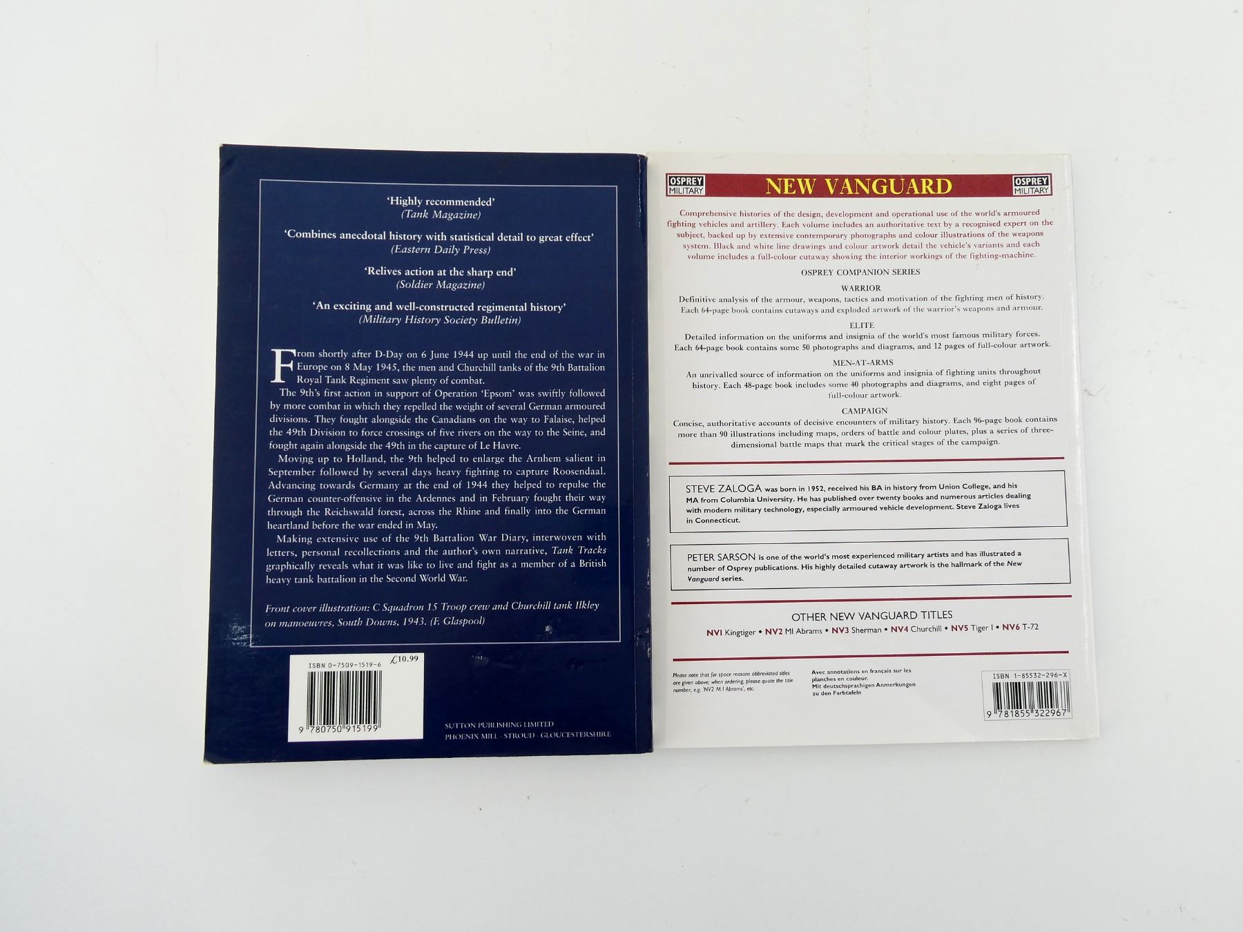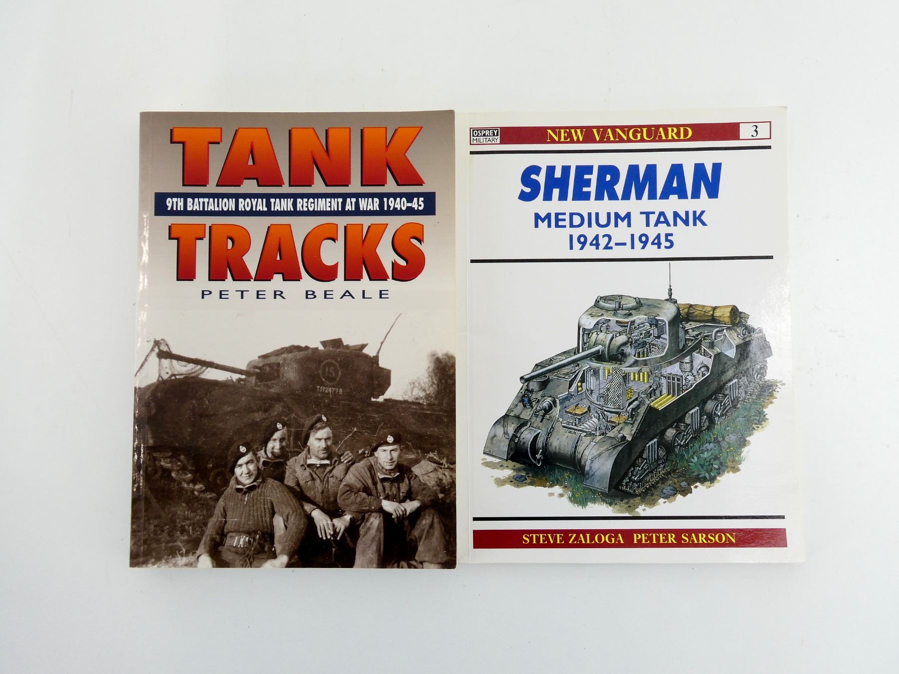 SOFT COVERS, LOT INCLUDES; (1) "SHERMAN MEDIUM TANK 1942-1945" BOOK BY STEVE ZALOGA & PETER SARSON, ISBN: 185532-296-X & (1) "TANK TRACKS, 9TH BATTALION ROYAL TANK REGIMENT AT WAR 1940-45" BOOK BY PETER BEALE, ISBN: 0-7509-1519-6. SEE PHOTOS.