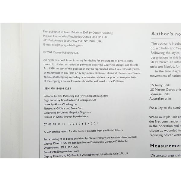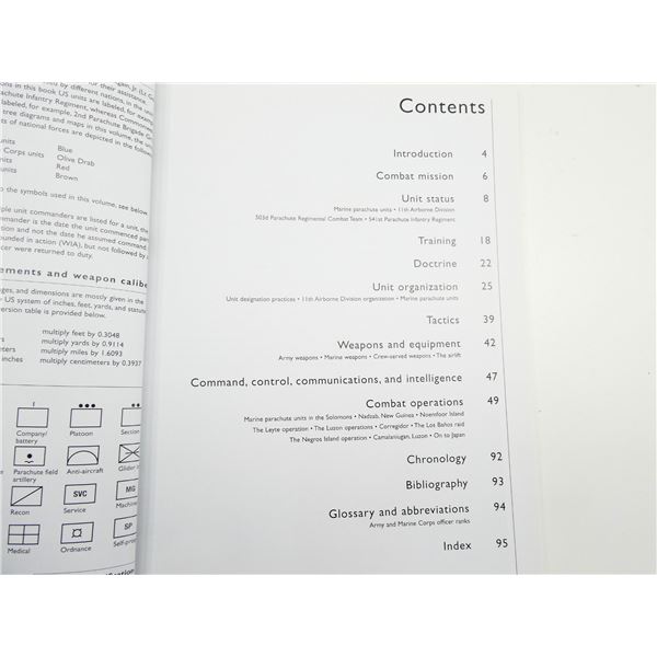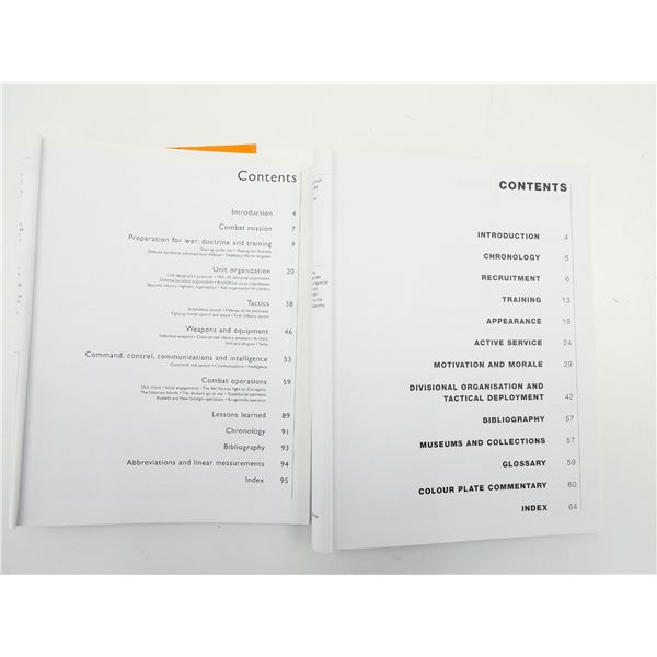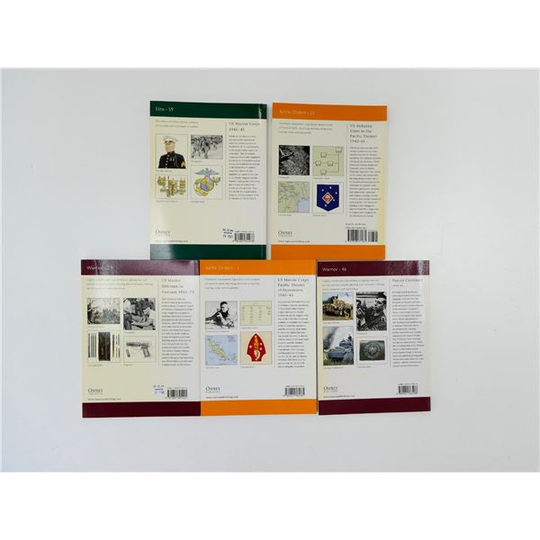 SOFT COVERS, VARIOUS AUTHORS, SERIES NOT COMPLETE / SOME ISSUES MISSING, LOT INCLUDES; (1) "BATTLE ORDERS - I, US MARINE CORPS PACIFIC THEATER OF OPERATIONS 1941-43" BOOK, ISBN: 1-84176-518-X, (1) "BATTLE ORDERS - 26, US AIRBORNE UNITS IN THE PACIFIC THEATER 1942-45" BOOK, ISBN: 978-1-84603-128-1, (1) "WARRIOR - 23, US MARINE RIFLEMAN IN VIETNAM 1965-73" BOOK, ISBN: 1-85532-542-X, (1) "WARRIOR - 46, PANZER CREWMAN 1939-45" BOOK, ISBN: 1-84176-328-4 & (1) "ELITE - 59, US MARINE CORPS 1941-45" BOOK, ISBN: 1-85532-497-0. SEE PHOTOS.