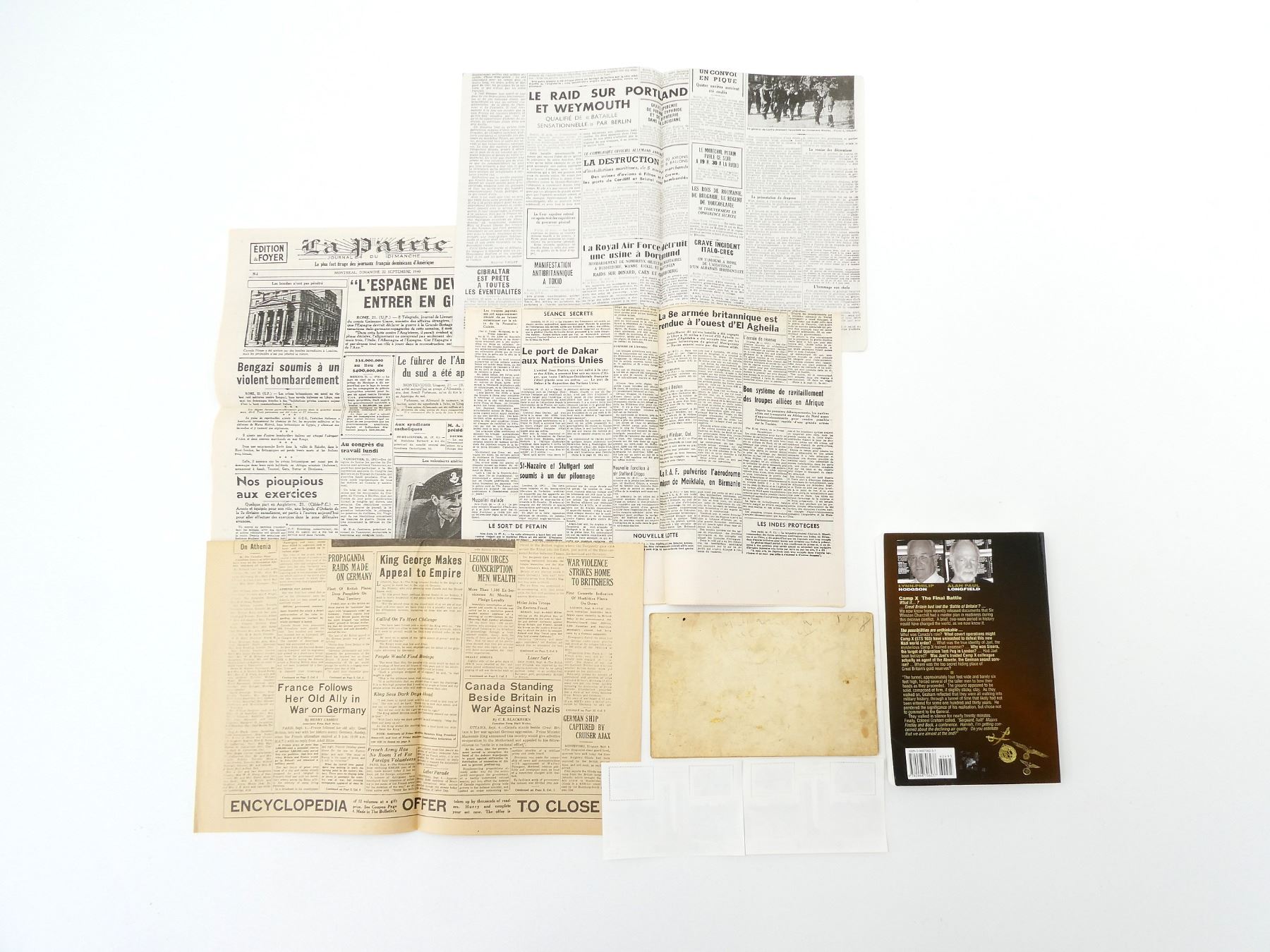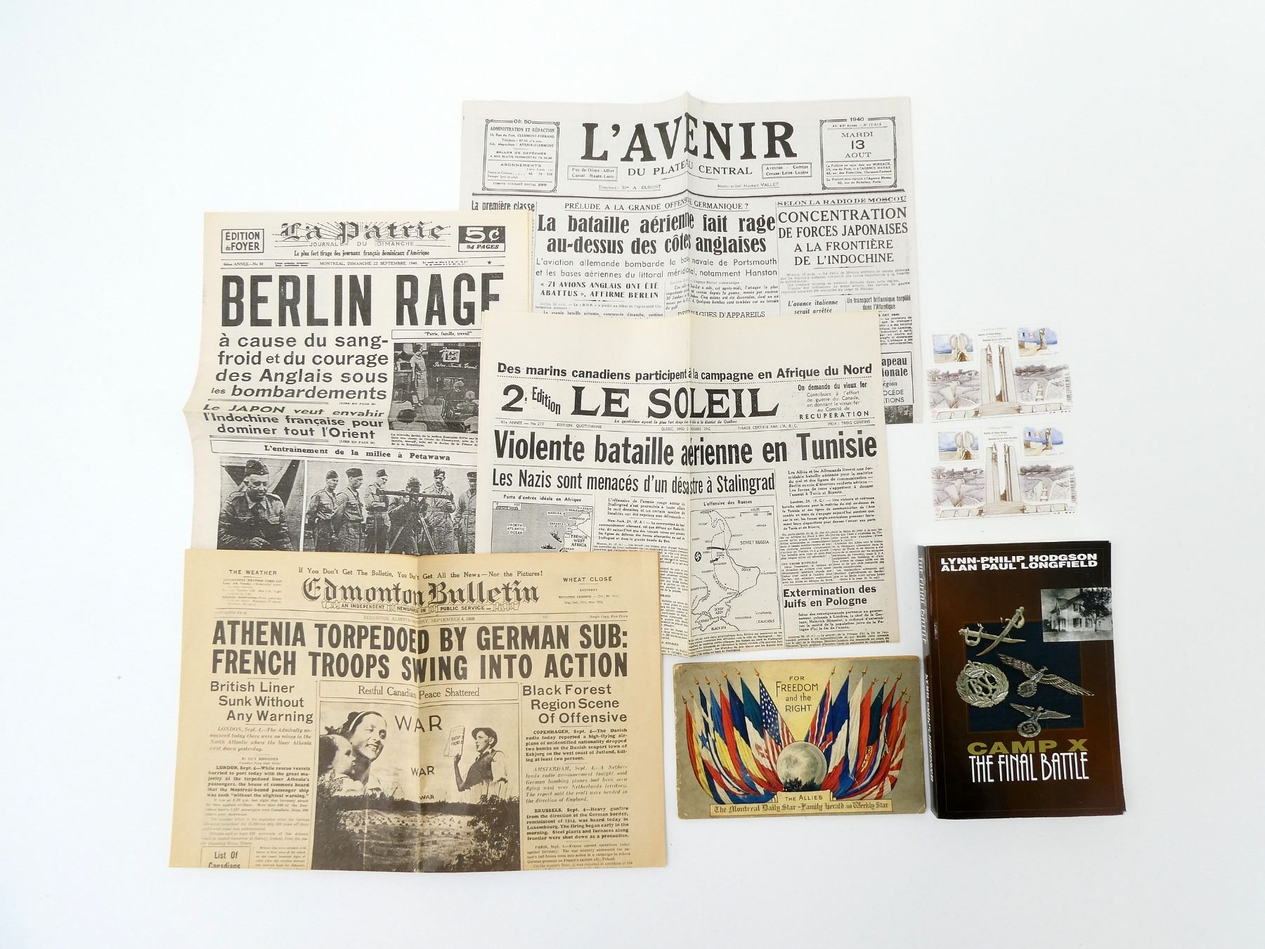 LOT INCLUDES; (1) "CAMP X, THE FINAL BATTLE" BOOK BY LYNN-PHILIP HODGSON & ALAN PAUL LONGFIELD, SOFT COVER, SIGNED BY AUTHORS, ISBN: 0-9687062-3-1, (1) "FOR FREEDOM AND THE RIGHT" NEWSPAPER PUBLISHED BY THE MONTREAL DAILY STAR, THE FAMILY HERALD & WEEKLY STAR, (1) "EDMONTON BULLETIN" PUBLISHED 1939, (1) "LE SOLEIL" PUBLISHED 1942, (1) "LA PATRIE" PUBLISHED 1940, (1) "L'AVENIR" PUBLISHED 1940 & (1) BATTLE OF VIMY RIDGE MINT CONDITION STAMP SET. SEE PHOTOS.