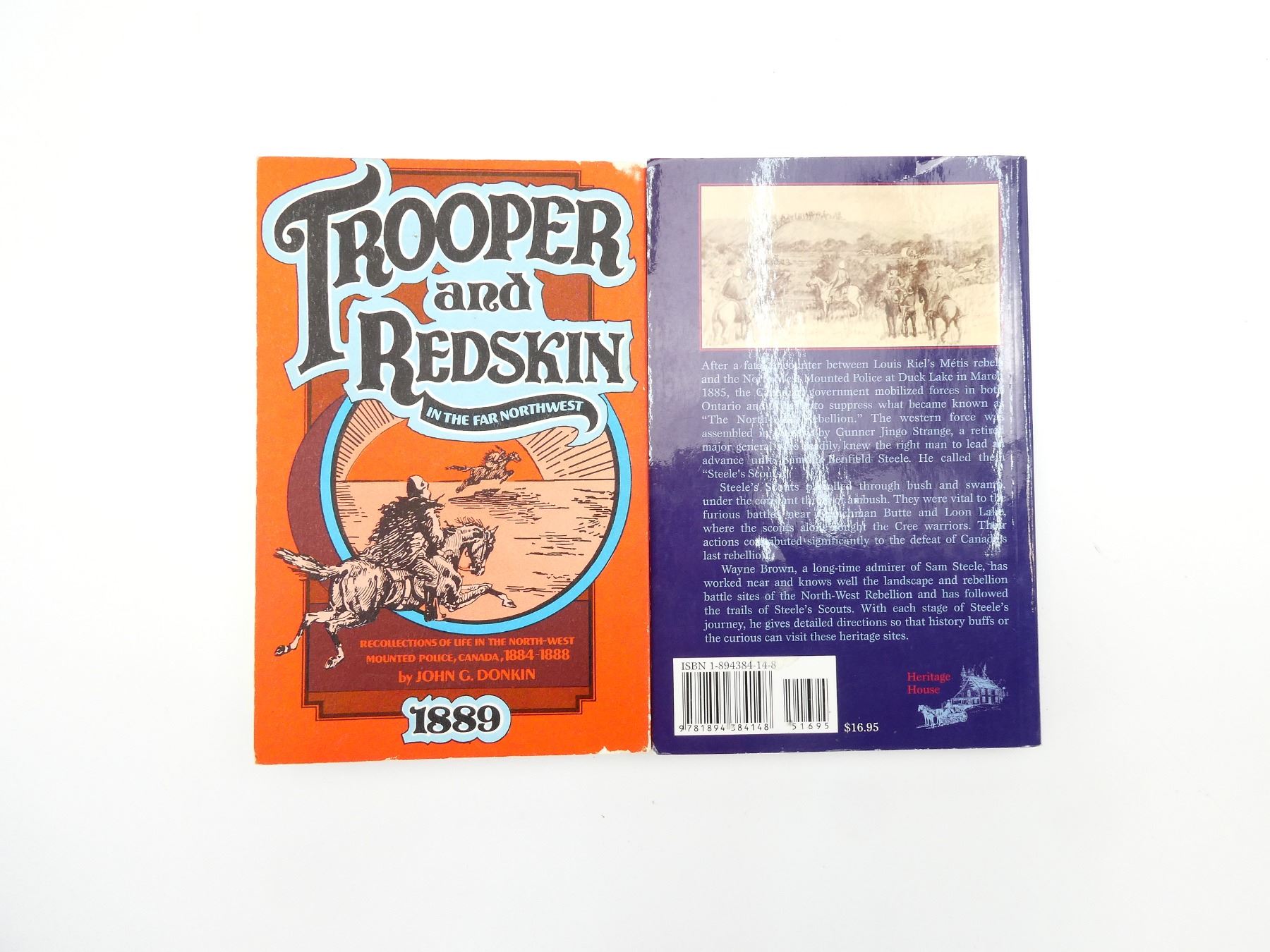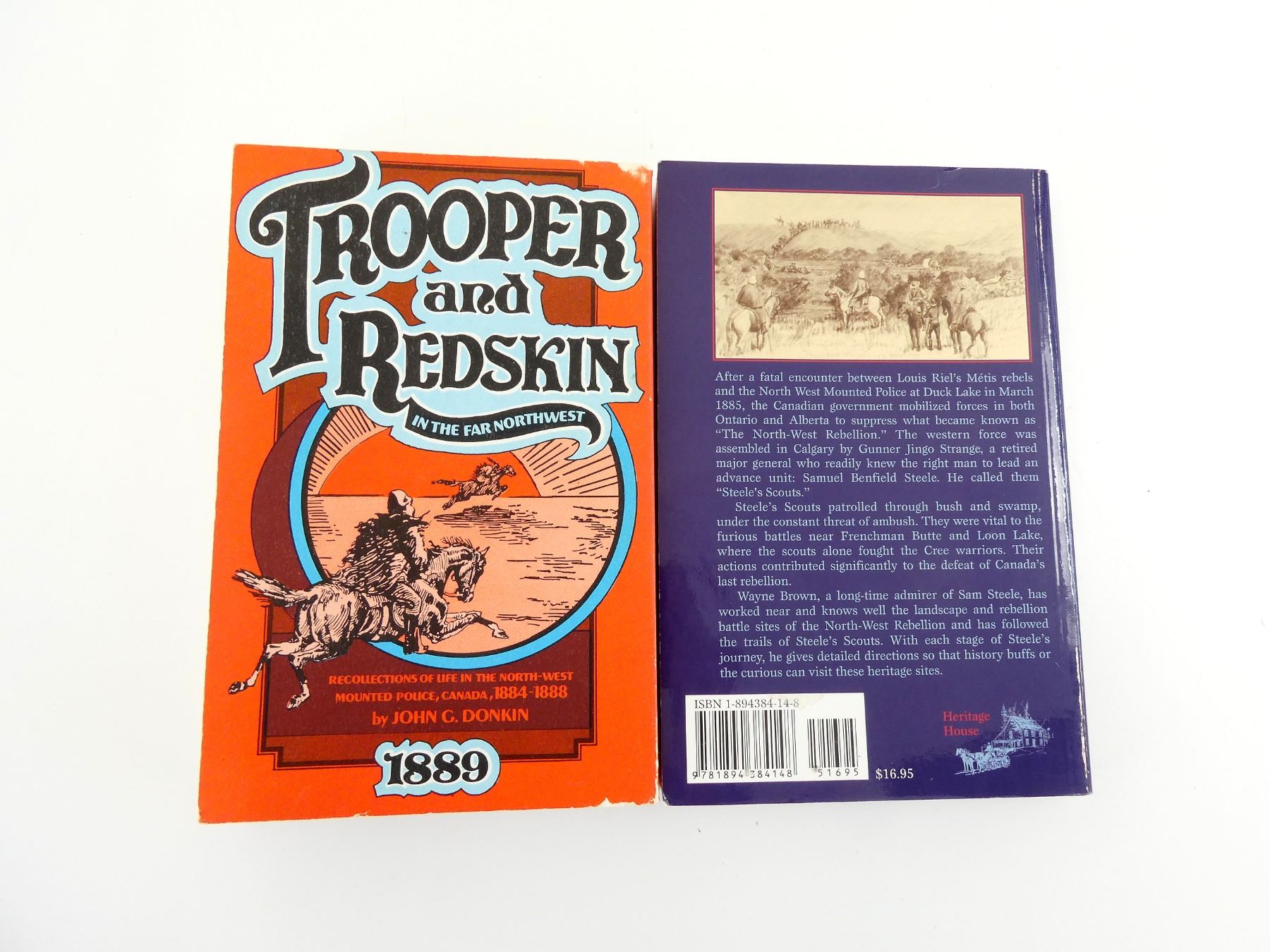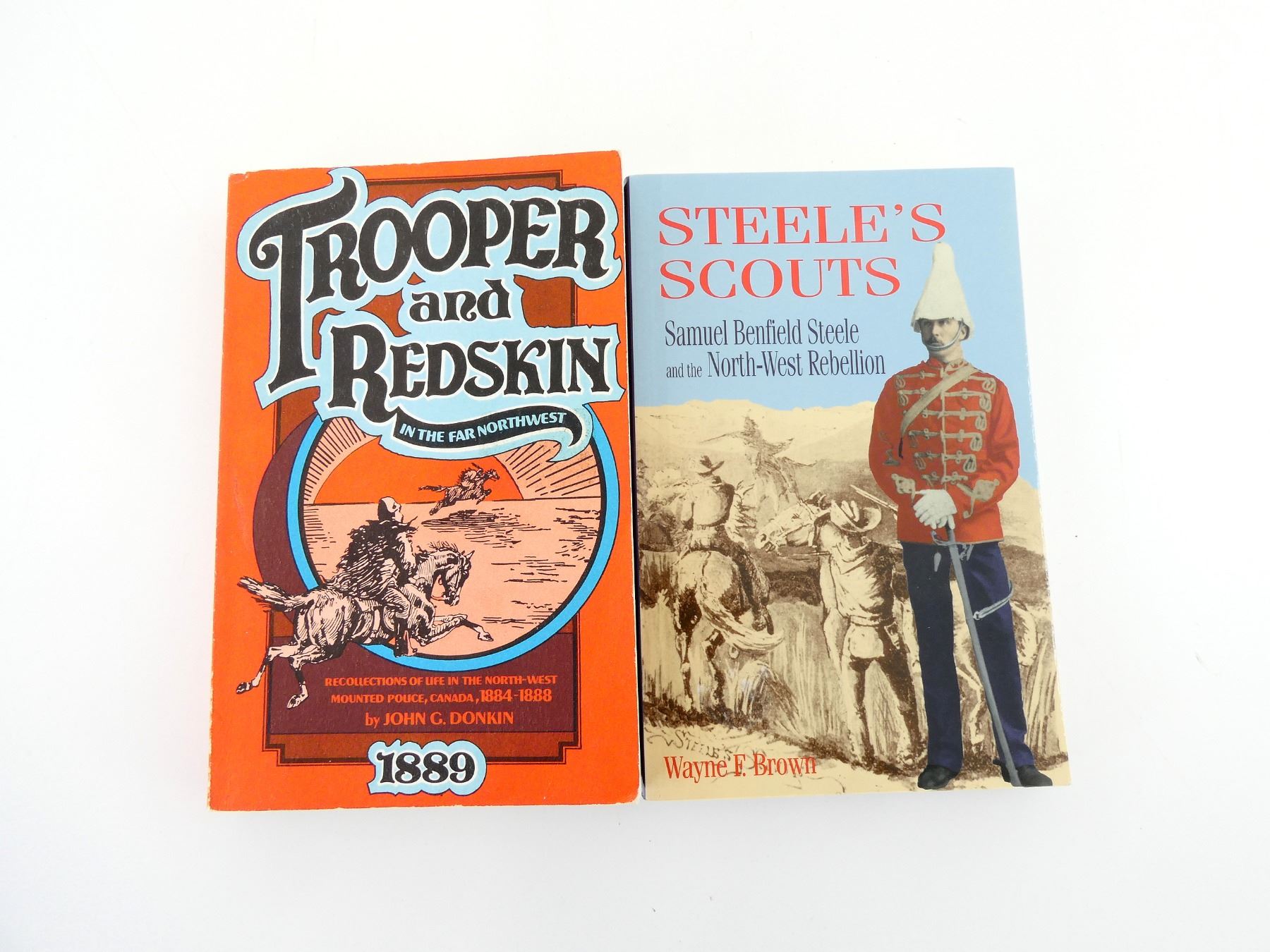 SOFT COVERS, LOT INCLUDES; (1) "TROOPER AND REDSKIN IN THE FAR NORTHWEST, RECOLLECTIONS OF LIFE IN THE NORTH-WEST MOUNTED POLICE, CANADA, 1884-1888" BOOK BY JOHN G. DONKIN, COPYRIGHT 1973 & (1) "STEELE'S SCOUTS SAMUEL BENFIELD STEELE AND THE NORTH-WEST REBELLION" BOOK BY WAYNE F. BROWN, ISBN: 1-894384-14-8. SEE PHOTOS.