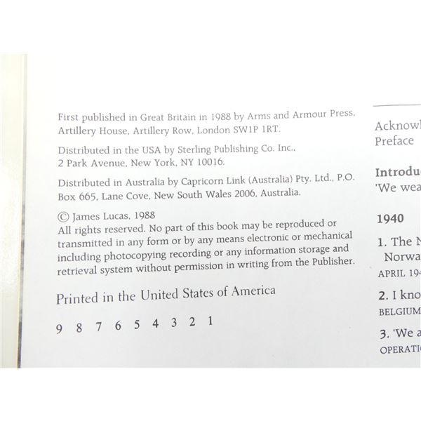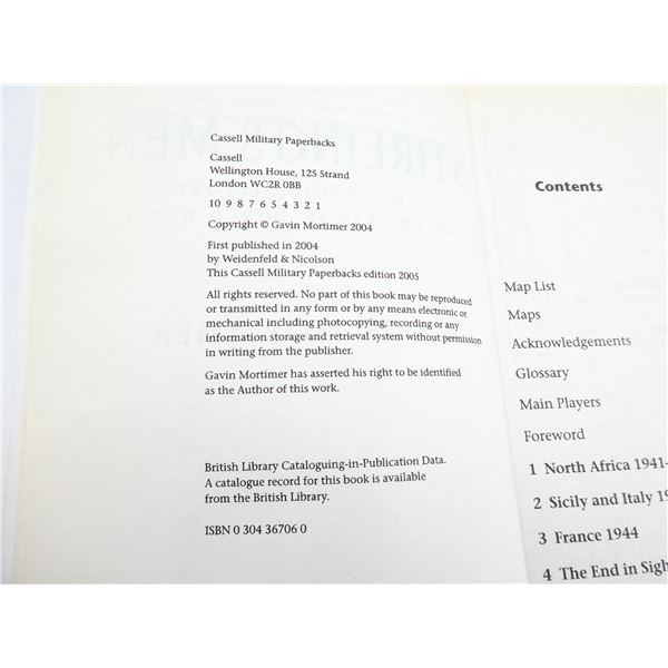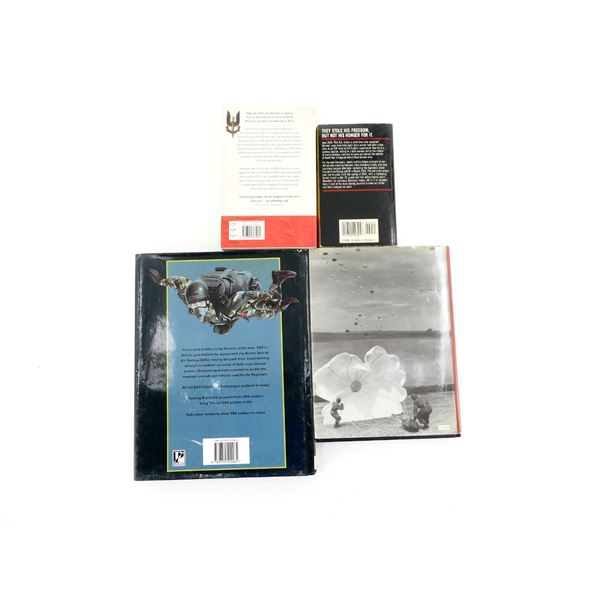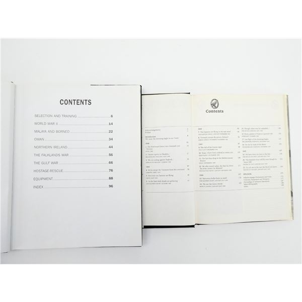 LOT INCLUDES; (1) "STIRLING'S MEN, THE INSIDE HISTORY OF THE SAS IN WORLD WAR II" BOOK BY GAVIN MORTIMER, SOFT COVER, ISBN: 0-304-36706-0, (1) "STORMING EAGLES, GERMAN AIRBORNE FORCES IN WORLD WAR TWO" BOOK BY JAMES LUCAS, HARD COVER WITH DUST COVER, COPYRIGHT 1988, (1) "SAS IN ACTION" BOOK BY CHRIS CHANT, HARD COVRE WITH DUST COVER, ISBN: 0-7525-2226-4 & (1) "MOONLESS NIGHT" BOOK BY B.A. JAMES, SOFT COVER, ISBN: 0-8041-0451-4. SEE PHOTOS.