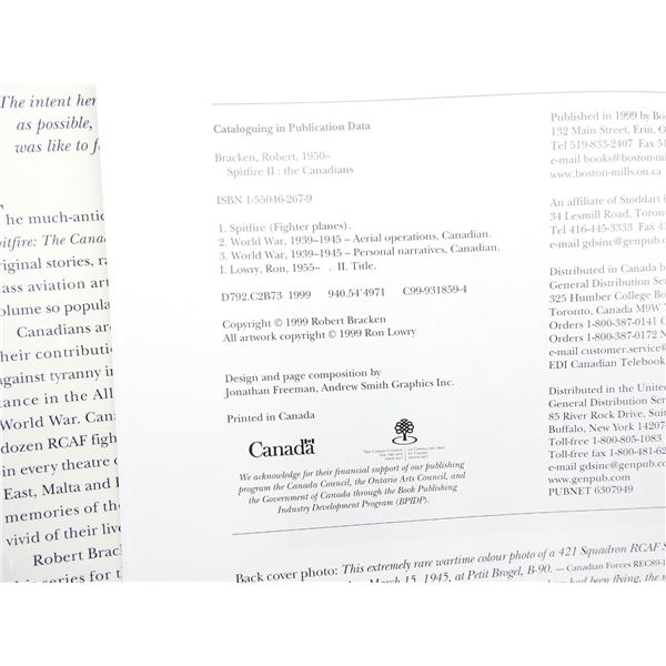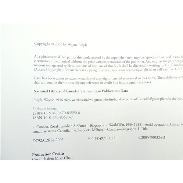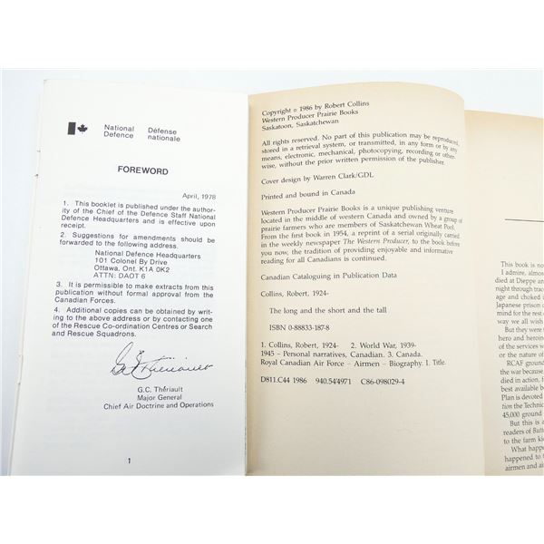 LOT INCLUDES; (1) "ACES, WARRIORS & WINGMEN, FIRSTHAND ACCOUNTS OF CANADA'S FIGHTER PILOTS IN THE SECOND WORLD WAR" BOOK BY WAYNE RALPH, HARD COVER WITH DUST COVER, ISBN: 0-470-83590-7, (1) "ANTI-TANK HELICOPTERS" BOOK BY STEVEN J. ZALOGA & GEORGE J. BALIN, SOFT COVER, ISBN: 0-85045-697-5, (1) "MESSERSCHMITT" BOOK BY ARMAND VAN ISHOVEN, SOFT COVER, ISBN: 0-9044-42047, (1) "THE LONG AND THE SHORT AND THE TALL" BOOK BY ROBERT COLLINS, SOFT COVER, ISBN: 0-88833-291-2, (1) "SPITFIRE II, THE CANADIANS" BOOK BY ROBERT BRACKEN, HARD COVER WITH DUST COVER, ISBN: 1-55046-267-9, (1) "A.N.E.C. MISSEL THRUSH" ARTICLE PUBLISHED 1979, (1) "NATIONAL AERONAUTICAL COLLECTION" BOOK, SOFT COVER, IN ENGLISH/FRENCH, (1) "THE AIR ALMANAC 1974, SEPTEMBER-DECEMBER" BOOK PUBLISHED BY HER MAJESTY'S STATIONERY OFFICE, COPYRIGHT 1974 & (1) "MAYDAY, MAYDAY, MAYDAY" BOOK PUBLISHED BY NATIONAL DEFENCE HEADQUARTERS 1978. SEE PHOTOS.
