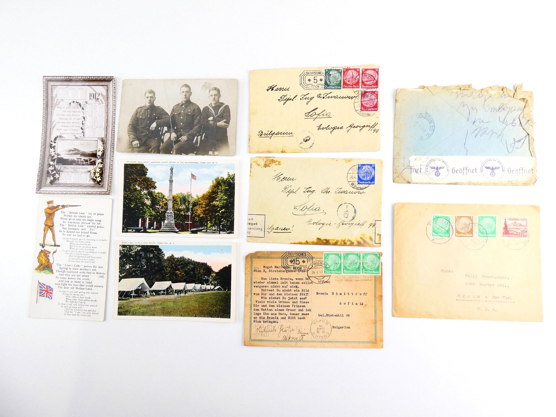 LOT INCLUDES; (5) BRITISH AND AMERICAN WWI POSTCARDS, (1) WWII STAMPED POSTCARD & (4) WWII STAMPED ENVELOPES. SEE PHOTOS.