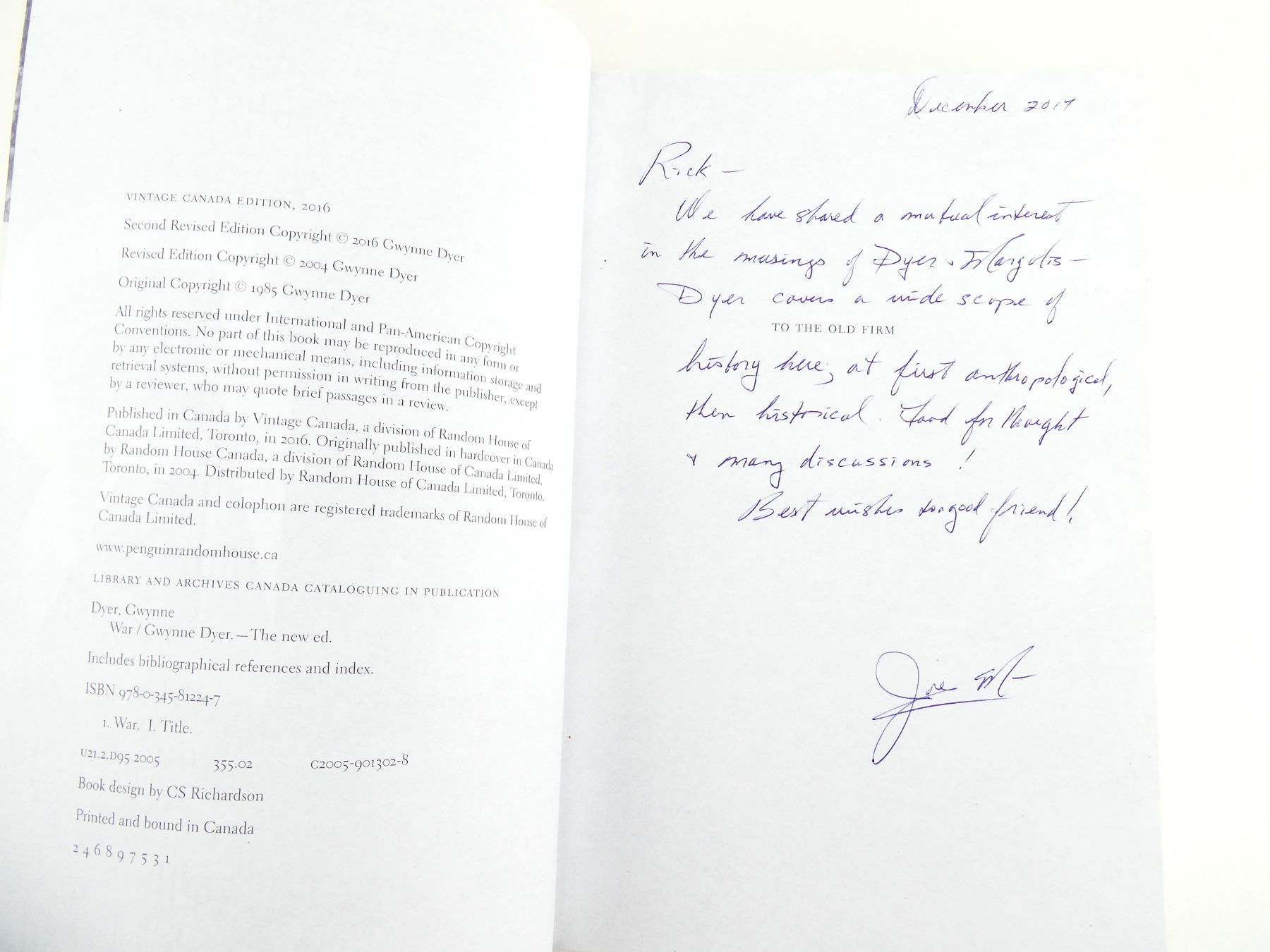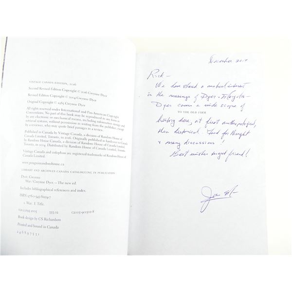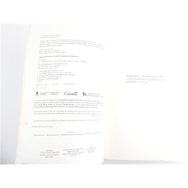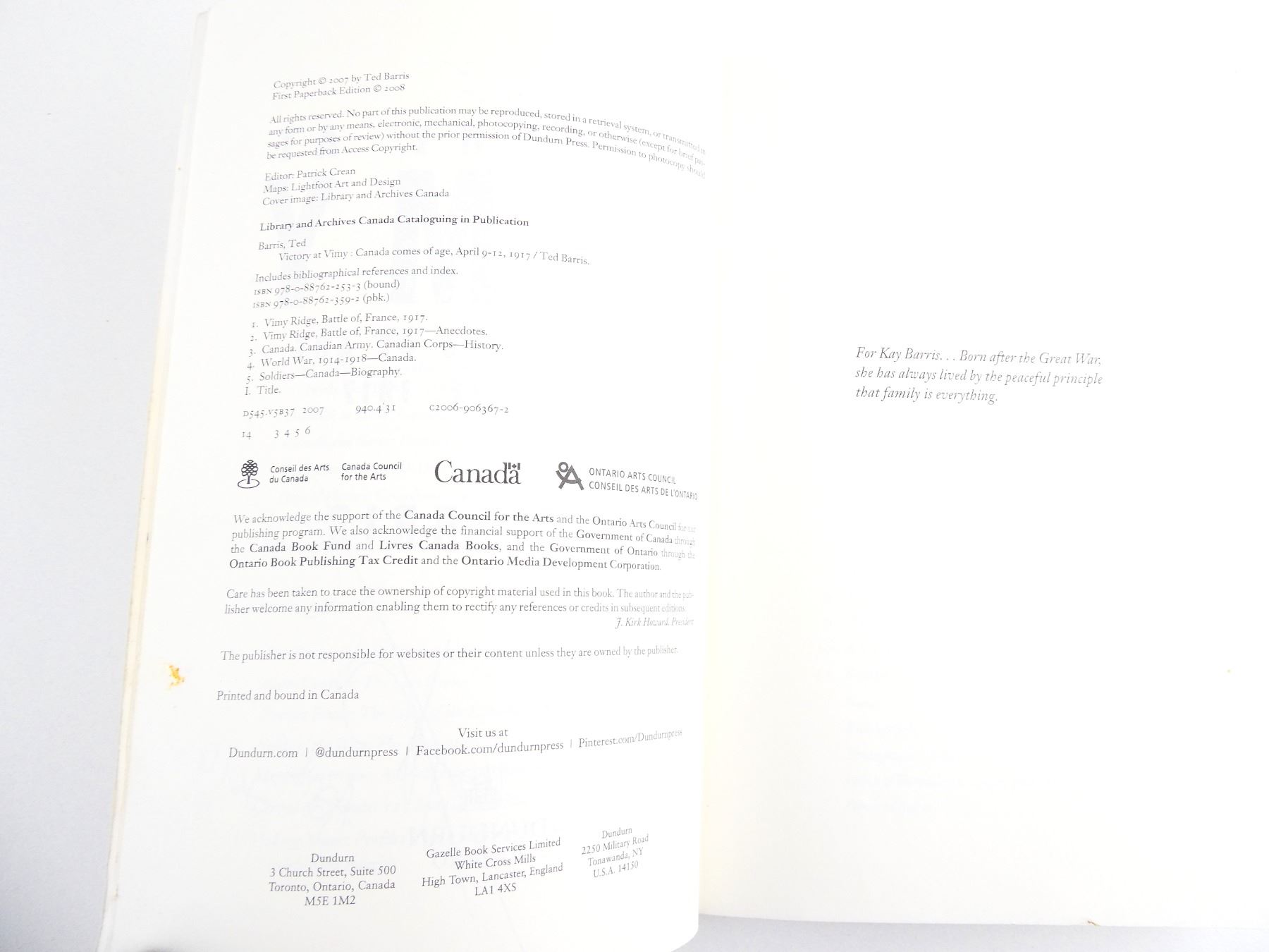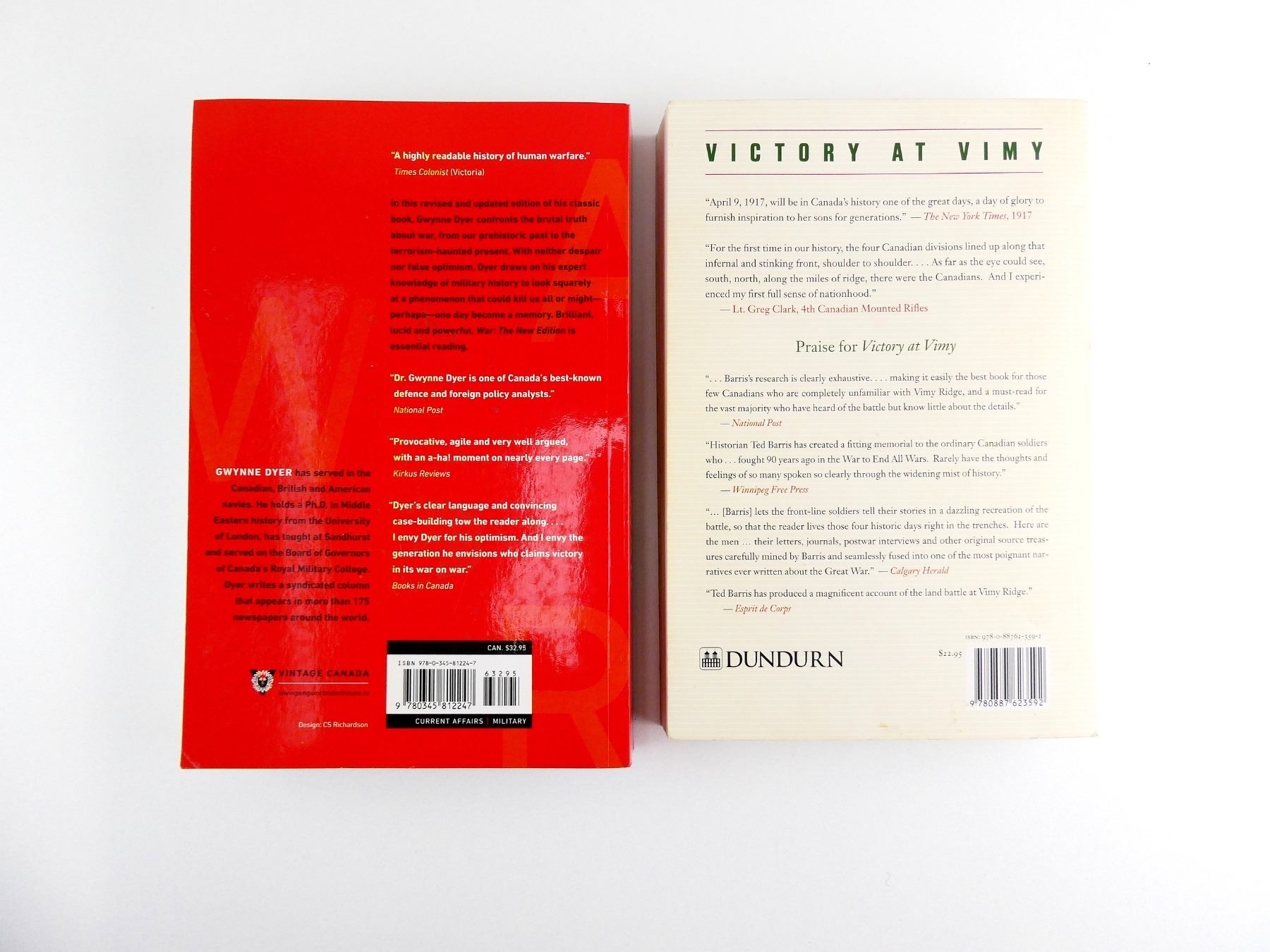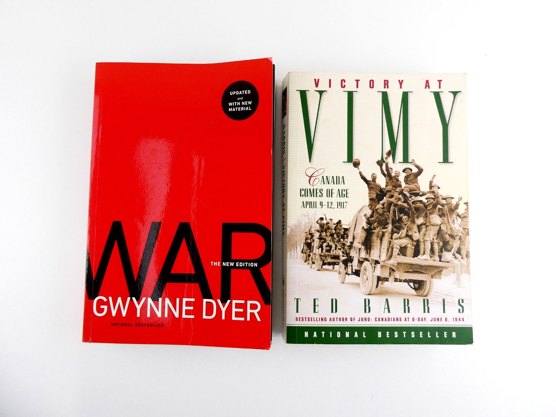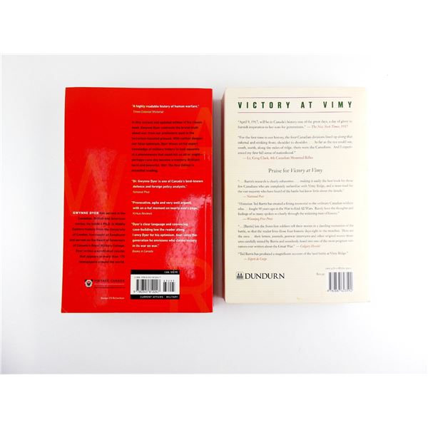 SOFT COVERS, LOT INCLUDES; (1) "VICTORY AT VIMY" BOOK BY TED BARRIS, ISBN: 978-0-88762-359-2 & (1) "WAR" BOOK BY GWYNNE DYER, ISBN: 978-0345-81224-7. SEE PHOTOS.