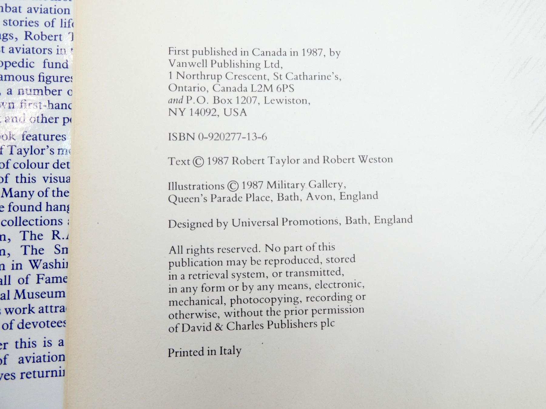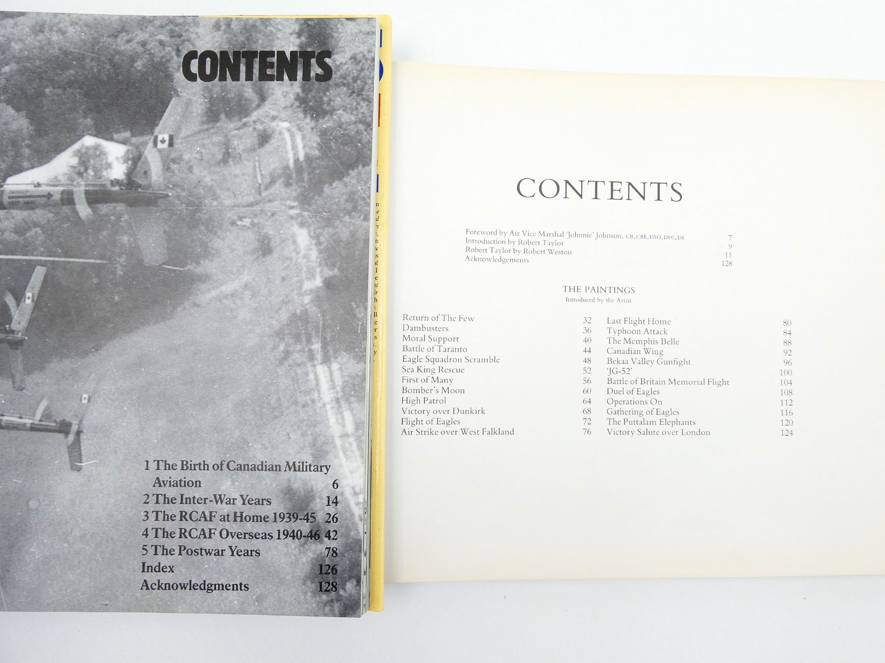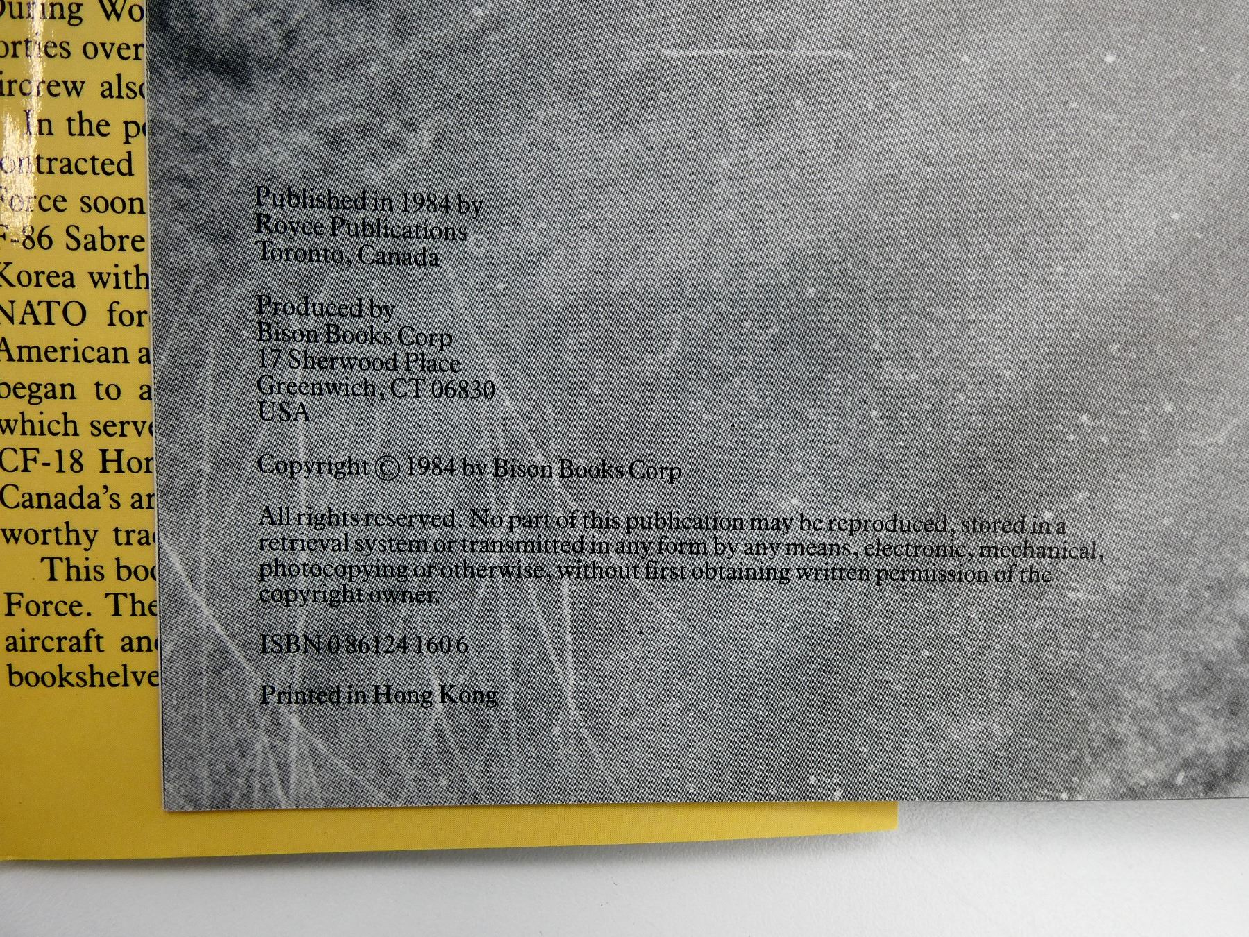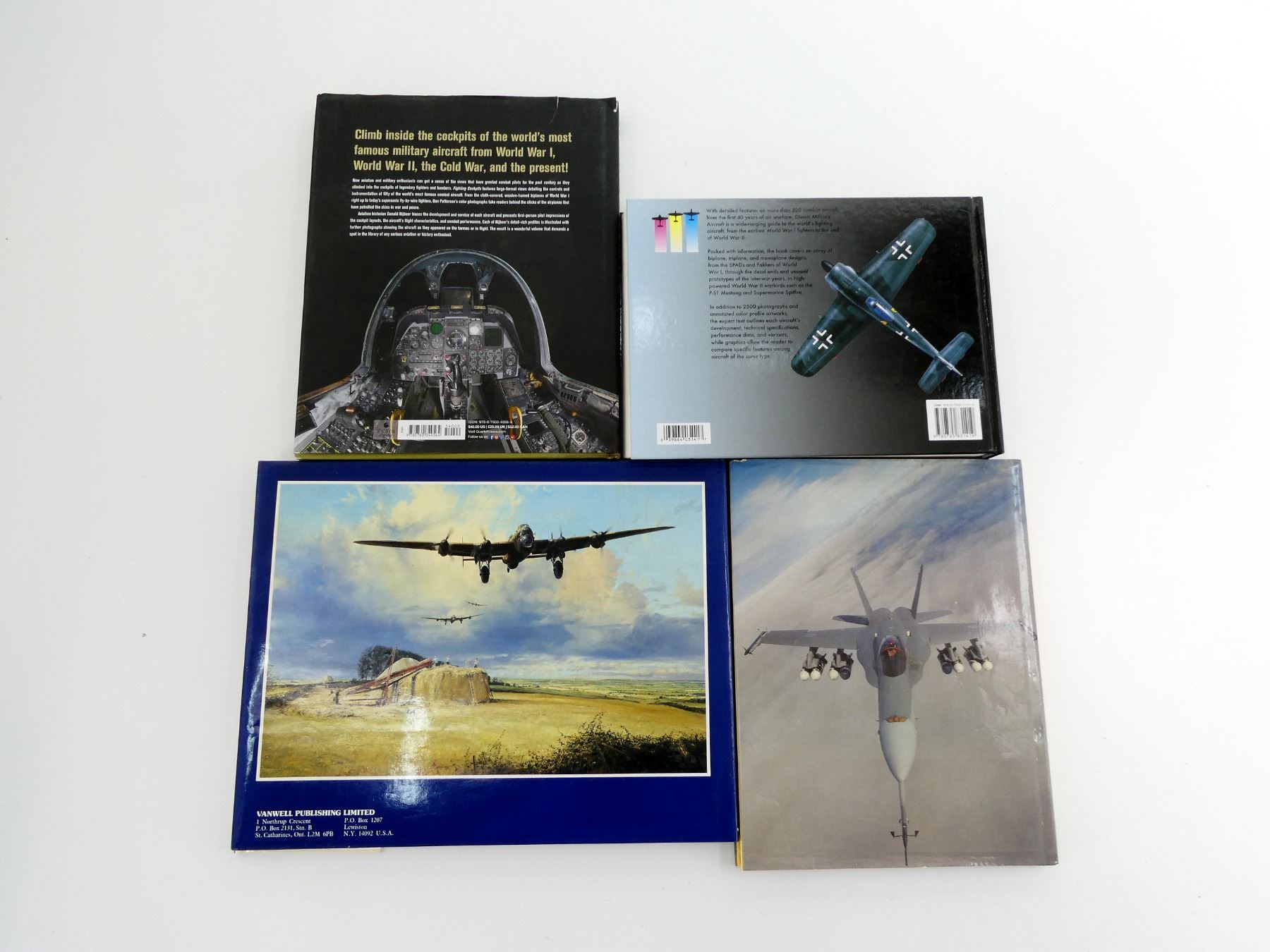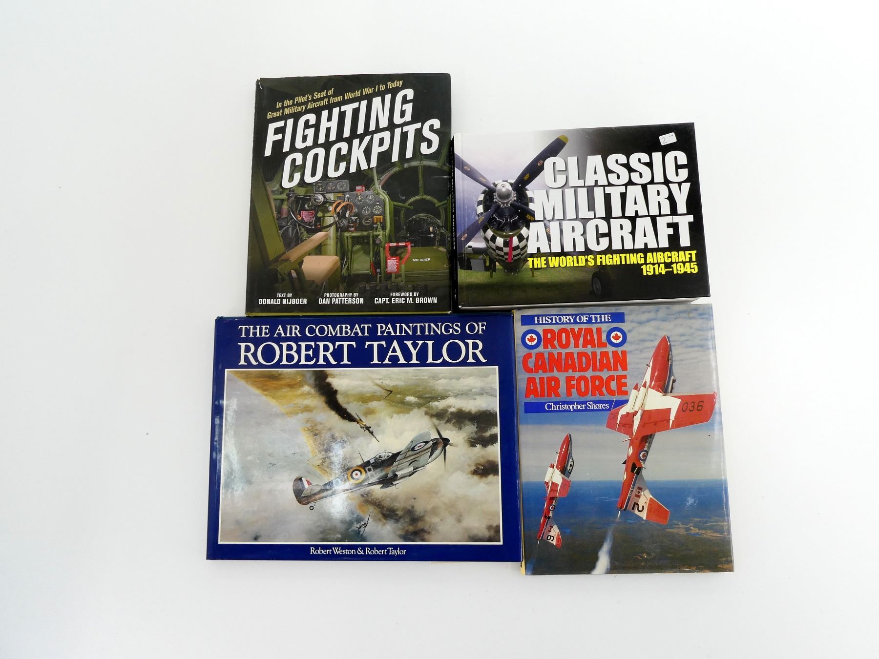 LOT INCLUDES; (1) "THE AIR COMBAT PAINTINGS OF ROBERT TAYLOR" BOOK BY ROBERT WESTON & ROBERT TAYLOR, HARD COVER WITH DUST COVER, ISBN: 0-920277-13-6, (1) "FIGHTING COCKPITS" BOOK BY DONALD NIJBOER & DAN PATTERSON, HARD COVER WITH DUST COVER, ISBN: 978-0-7603-4956-4, (1) "CLASSIC MILITARY AIRCRAFT, THE WORLD'S FIGHTING AIRCRAFT 1914-1945" BOOK EDITED BY JIM WINCHESTER, HARD COVER, ISBN: 978-0-7858-3141-9 & (1) "HISTORY OF THE ROYAL CANADIAN AIR FORCE" BOOK BY CHRISTOPHER SHORES, HARD COVER WITH DUST COVER, ISBN: 0-86124-160-6. SEE PHOTOS.