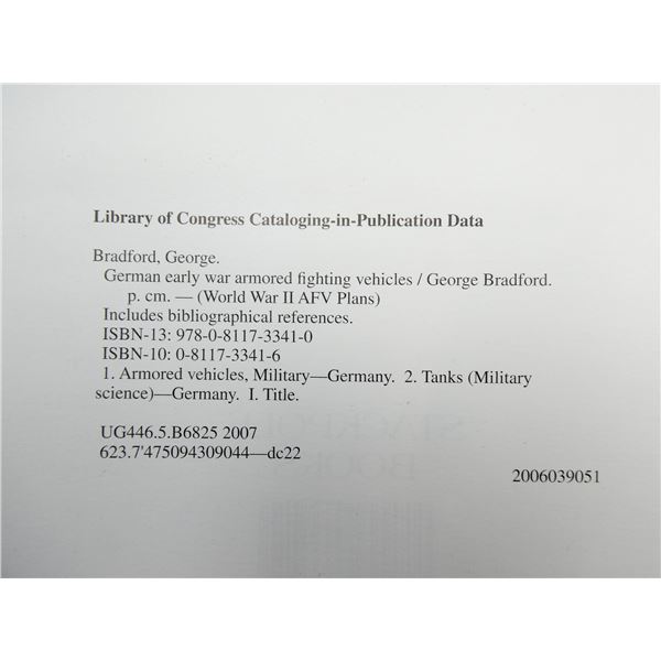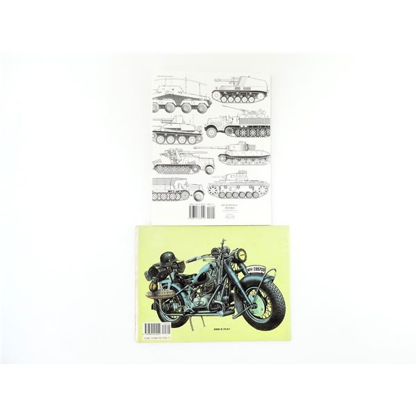 SOFT COVERS, LOT INCLUDES; (1) :GERMAN EARLY WAR ARMORED FIGHTING VEHICLES" BOOK BY GEORGE BRADFORD, ISBN: 978-0-8117-3341-0 & (1) "GERMAN MOTORCYCLES IN WORLD WAR II" BOOK BY STEFAN KNITTEL, ISBN: 0-88740-205-4. SEE PHOTOS.