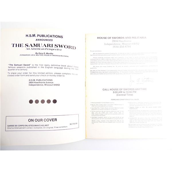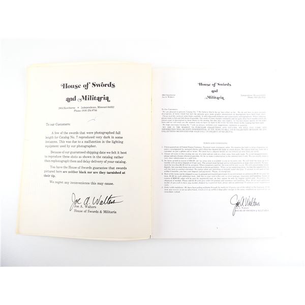 SOFT COVERS, LOT INCLUDES; (1) "HOUSE OF SWORDS AND MILITARIA CATALOGUE NUMBER SEVEN" WITH ACCOMPANYING "SPECIAL OFFERING SUPPLEMENT" & (1) "HOUSE OF SWORDS AND MILITARIA CATALOGUE NO. 12". SEE PHOTOS.