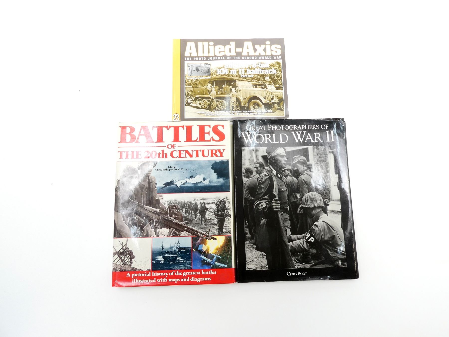 LOT INCLUDES; (1) "ALLIED-AXIS, THE PHOTO JOURNAL OF THE SECOND WORLD WAR" BOOK PUBLISHED BY AMPERSAND PUBLISHING COMPANY INC., SOFT COVER, COPYRIGHT 2009, (1) "GREAT PHOTOGRAPHERS OF WORLD WAR II" BOOK BY CHRIS BOOT, HARD COVER WITH DUST COVER, ISBN: 0-86124-738-8 & (1) "BATTLES OF THE 20TH CENTURY, A PICTORAL HISTORY OF THE GREATEST BATTLES ILLUSTRATED WITH MAPS AND DIAGRAMS" BOOK BY CHRIS BISHOP & IAN C. DRURY, HARD COVER WITH DUST COVER, ISBN: 0-600-55807-X. SEE PHOTOS.