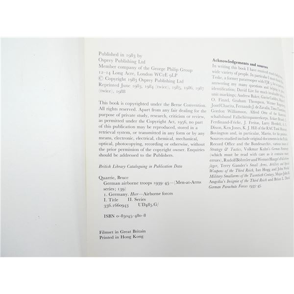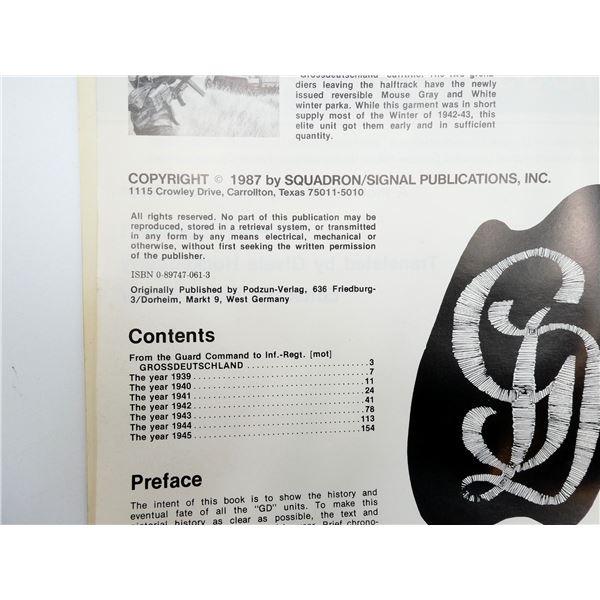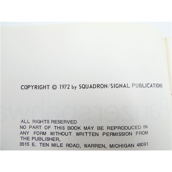 SOFT COVERS, LOT INCLUDES; (1)"SQUADRON/SIGNAL PUBLICATIONS ARMOR NUMBER 3, GERMAN HALFTRACKS IN ACTION" BOOK PUBLISHED BY SQUADRON/SIGNAL PUBLICATIONS, COPYRIGHT 1972, (1) "SQUADRON/SIGNAL PUBLICATIONS ARMOR NUMBER 4, PANZERSPAHWAGEN IN ACTION" BOOK PUBLISHED BY SQUADRON/SIGNAL PUBLICATIONS, COPYRIGHT 1972, (1) "OSPREY MEN-AT-ARMS SERIES 139, GERMAN AIRBORNE TROOPS 1939-45" BOOK BY BRUCE QUARRIE & MIKE CHAPPELL, ISBN: 0-85045-480-8, (1) "PANZER GRENADIER DIVISION, GROSSDEUTSCHLAND" BOOK BY HORST SCHEIBERT, ISBN: 0-89747-061-3 & (1) "KUBELWAGEN AND SCHWIMMWAGEN" BOOK BY DAVID DOYLE, ISBN: 978-1-944367-03-9. SEE PHOTOS.