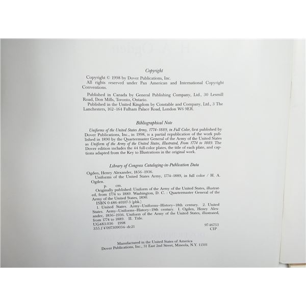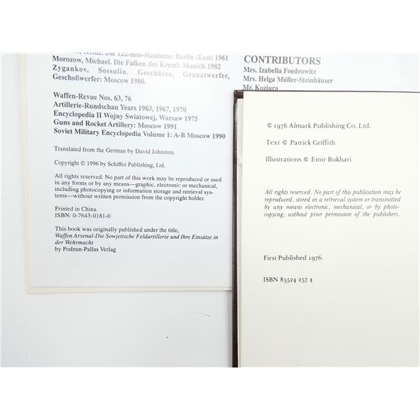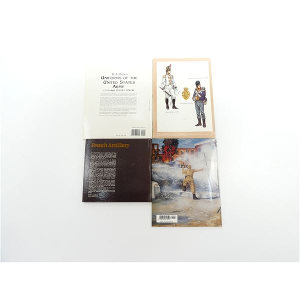 LOT INCLUDES; (1) "FRENCH ARTILLERY" BOOK BY PATRICK GRIFFITH, HARD COVER, ISBN: 0-85524-257-0, (1) "SOVIET FIELD ARTILLERY IN WORLD WAR II, INCLUDING USE BY THE GERMAN WEHRMACHT" BOOK BY MICHAEL FOEDROWITZ, SOFT COVER, ISBN: 0-7643-0181-0, (1) "SOLDIERS OF THE NAPOLEONIC WARS, THE ROYAL ARTILLERY, (7) UNIFORMS AND EQUIPMENT" BOOK BY ALAN KEMP, SOFT COVER & (1) "UNIFORMS OF THE UNITED STATES ARMY 1774-1889, IN FULL COLOR" BOOK BY H.A. OGDEN, SOFT COVER, ISBN: 0-486-40107-3. SEE PHOTOS.
