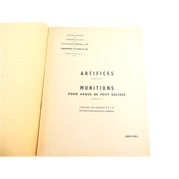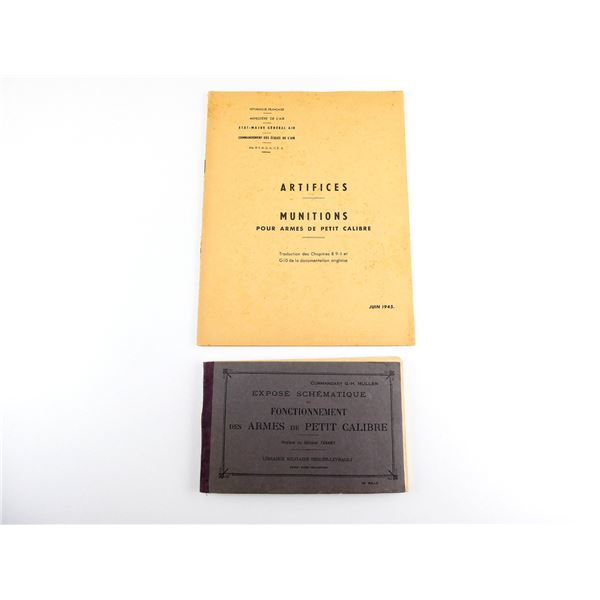 SOFT COVERS, IN FRENCH, LOT INCLUDES; (1) "EXPOSE SCHEMATIQUE DU FONCTIONNEMENT DES ARMES DE PETIT CALIBRE" BOOK BY G.-H. MULLER & (1) "ARTIFICES, MUNITIONS POUR ARMES DE PETIT CALIBRE" BOOK BY MINISTERE DE L'AIR, DATED 1945. SEE PHOTOS.