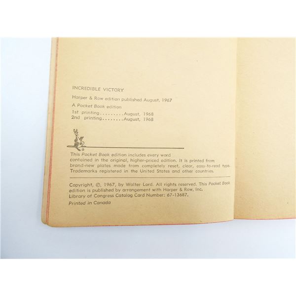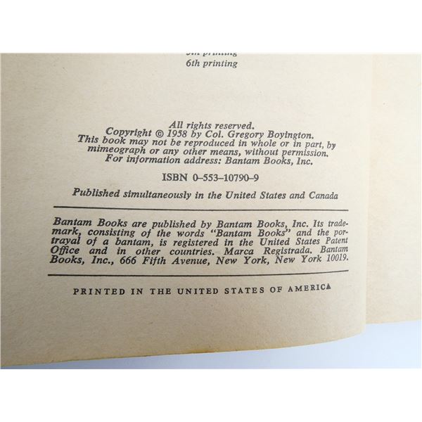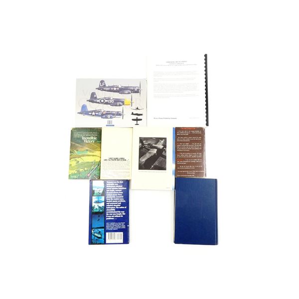 LOT INCLUDES; (1) "INCREDIBLE VICTORY" BOOK BY WALTER LORD, SOFT COVER, COPYRIGHT 1967, (1) "BLUE SKIES AND BLOOD, THE BATTLE OF THE CORAL SEA" BOOK BY EDWIN P. HOYT, HARD COVER, COPYRIGHT 1975, (1) "THE JOLLY ROGERS, THE STORY OF TOM BLACKBURN AND NAVY FIGHTING SQUADRON VF-17" BOOK BY TOM BLACKBURN, HARD COVER WITH DUST COVER, COPYRIGHT 1989, (1) "BAA BAA BLACK SHEEP" BOOK BY GREGORY "PAPPY" BOYINGTON, SOFT COVER, ISBN: 0-553-10790-9, (1) "MILITARY, RELIC, COLLECTORS REFERENCE BOOK AND CATALOG" BOOK BY WORLD WAR II PRODUCTS LTD, SOFT COVER, COPYRIGHT 1978, (1) "THE ILLUSTRATED HISTORY OF THE VIETNAM WAR, HELICOPTERS," BOOK BY JOHN GUILMARTIN JR AND MICHAEL O'LEARY, SOFT COVER, ISBN: 0-553-34506-0, (1) PROFILES OF FLIGHT VOUGHT F4 CORSAIR" BOOK BY DAVE WINDLE AND MARTIN BOWMAN, HARD COVER WITH DUST COVER, ISBN: 978 1 84884 408 7 & (1) "AIRBORNE OPERATIONS, A GERMAN APPRAISAL" BOOK EDITED BY GORDON L. ROTTMAN AND LEROY WILSON, SOFT COVER, ISBN: 0-938570-02-1. SEE PHOTOS.