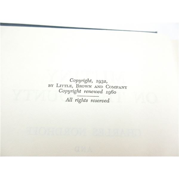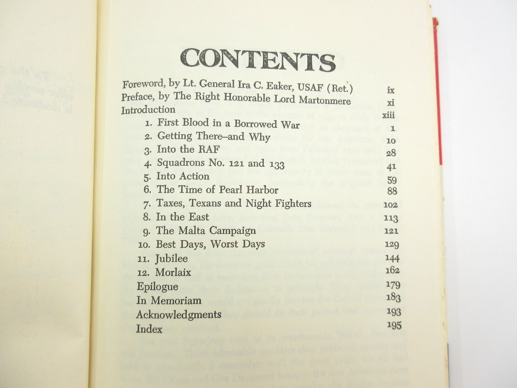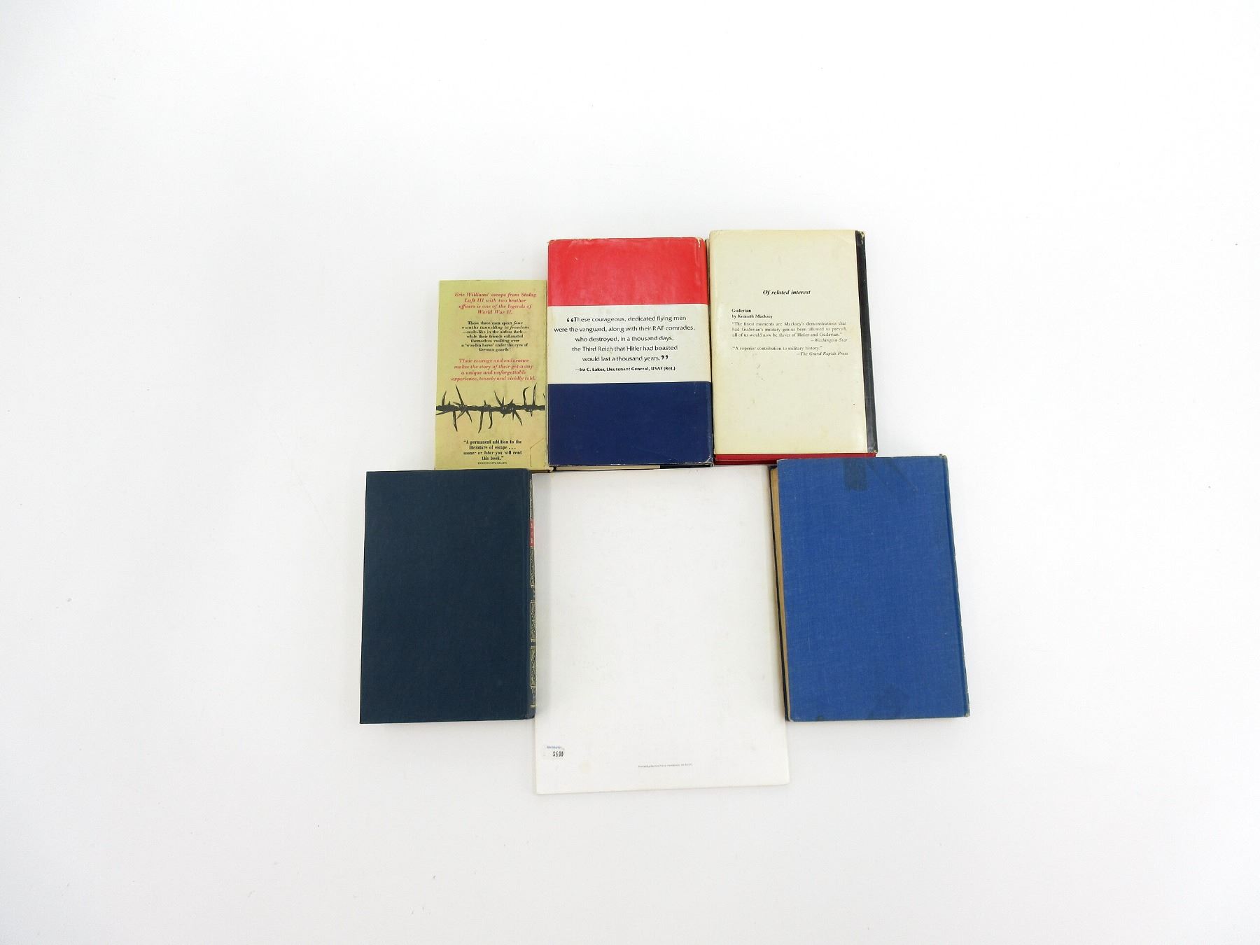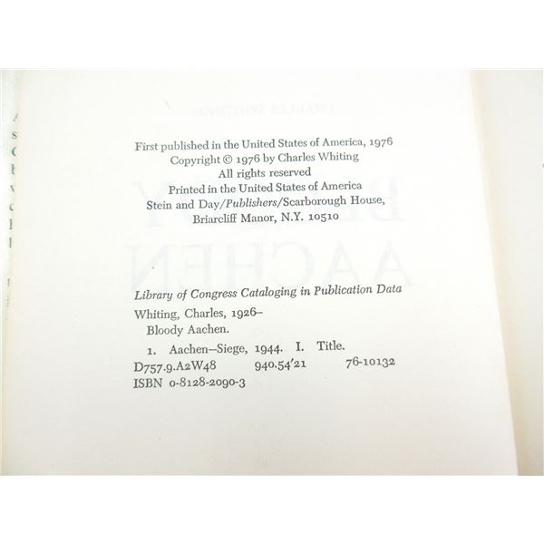LOT INCLUDES; (1) "THE EAGLE SQUADRONS, YANKS IN THE RAF 1940-1942" BOOK BY VERN HAUGHLAN, HARD COVER WITH DUST COVER, COPYRIGHT 1979, (1) "THE WOODEN HORSE, THE GREATEST ESCAPE STORY OF WORLD WAR II" BOOK BY ERIC WILLIAMS, HARD COVER, COPYRIGHT 1965, (1) "BLOODY AACHEN" BOOK BY CHARLES WHITING, HARD COVER WITH DUST COVER, ISBN: 0-8128-2090-3, (1) "VOYAGER'S SKETCHBOOK" BOOK BY JAMES A. HANSON, SOFT COVER, COPYRIGHT 1981, (1) "THE BATTLE OF JUTLAND" BOOK BY GEOFFREY BENNETT, HARD COVER, COPYRIGHT 1964 & (1) "MUTINY ON THE BOUNTY" BOOK BY CHARLES NORDHOFF AND JAMES NORMAN HALL, HARD COVER, COPYRIGHT 1960. SEE PHOTOS.