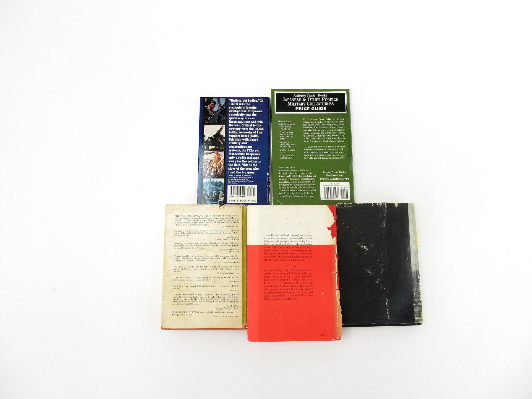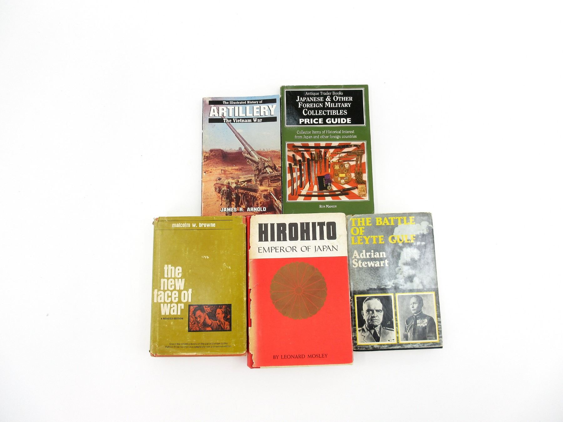 LOT INCLUDES; (1) "THE BATTLE OF LEYTE GULF" BOOK BY ADRIAN STEWART, HARD COVER WITH DUST COVER, COPYRIGHT 1979, (1) "JAPANESE & OTHER FOREIGN MILITARY COLLECTIBLES PRICE GUIDE" BOOK BY RON MANION, SOFT COVER, ISBN: 0-930625-43-9, (1) "HIROHITO EMPEROR OF JAPAN" BOOK BY LEONARD MOSLEY, HARD COVER WITH DUST COVER, COPYRIGHT 1966, (1) "THE ILLUSTRATED HISTORY OF THE VIETNAM WAR, ARTILLERY" BOOK BY JAMES R. ARNOLD, SOFT COVER, ISBN: 0-553-34319-X & (1) "THE NEW FACE OF WAR, A REVISED EDITION" BOOK BY MALCOLM W. BROWNE, HARD COVER WITH DUST COVER, COPYRIGHT 1968. SEE PHOTOS.
