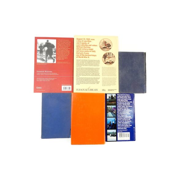 LOT INCLUDES; (1) "RIBBONS AND MEDALS" BOOK BY H. TAPRELL DORIN AND L.F. GUILLE, HARD COVER WITH DUST COVER. COPYRIGHT 1970, (1) "MY EARLY LIFE, SCHOOL EDITION" BOOK BY WINSTON S. CHURCHILL, HARD COVER, 1958, (1) "ESSENTIAL HISTORIES, THE SECOND WORLD WAR (5), THE EASTERN FRONT 1941-1945" BOOK BY GEOFFREY JUKES, SOFT COVER, ISBN: 1 84176 391 8, (1) "DIEPPE 1942 ECHOES OF DISASTER" BOOK BY WILLIAM WHITEHEAD, SOFT COVER, ISBN: 0-920510-79-5, (1) "A SEAMAN'S POCKETBOOK 1952" PUBLISHED BY HER MAJESTY'S STATIONERY OFFICE, HARD COVER, CROWN COPYRIGHT REPRINTED 1958 & (1) "THE ILLUSTRATED HISTORY OF THE VIETNAM WAR, RIVERINE FORCE" BOOK BY JOHN FORBES AND ROBERT WILLIAMS, SOFT COVER, ISBN: 0-553-34317-3. SEE PHOTOS.