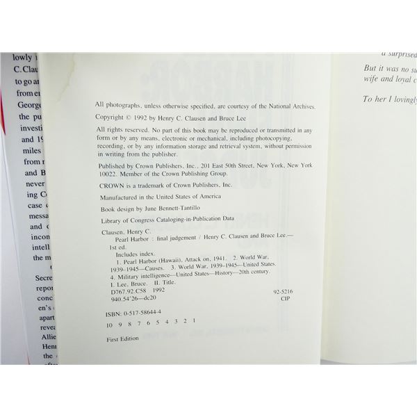 LOT INCLUDES; "PEARL HARBOR FINAL JUDGEMENT" BOOK BY HENRY C. CLAUSEN AND BRUCE LEE, HARD COVER WITH DUST COVER, ISBN: 0-517-58644-4, (1) "MAN OF WAR" BOOK BY CHARLIE SCHROEDER, HARD COVER WITH DUST COVER, ISBN: 978-1-59463-091-0 & (1) "SHADOW WARRIORS, INSIDE THE SPECIAL FORCES" BOOK BY TOM CLANCY, HARD COVER, ISBN: 0-399-14783-7. SEE PHOTOS.