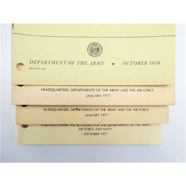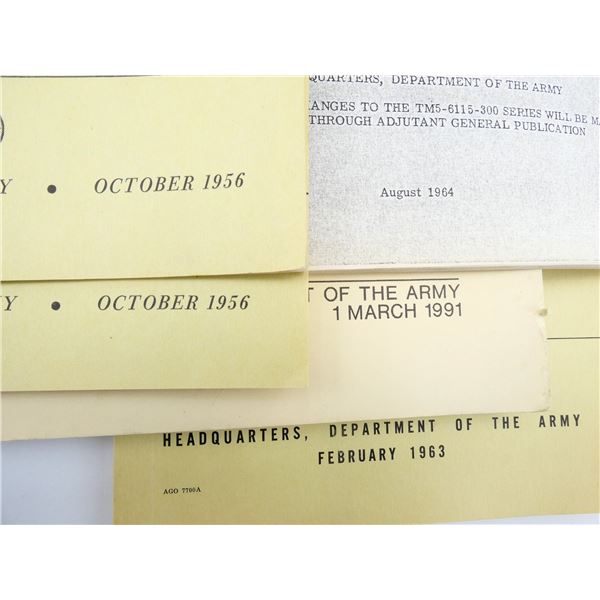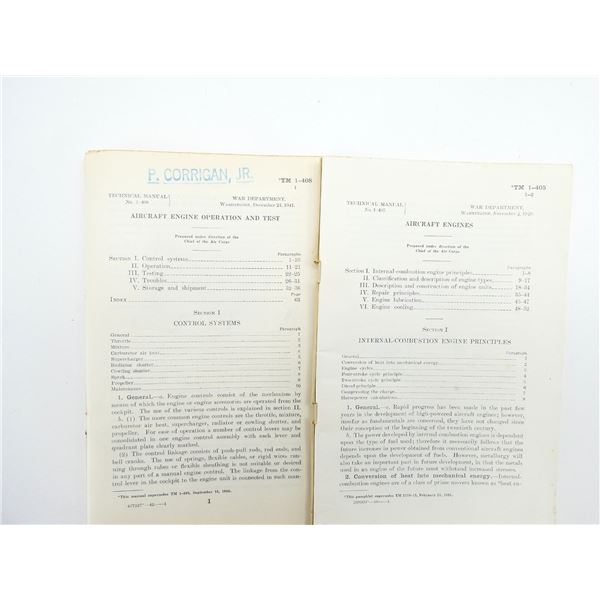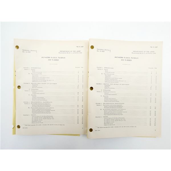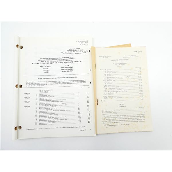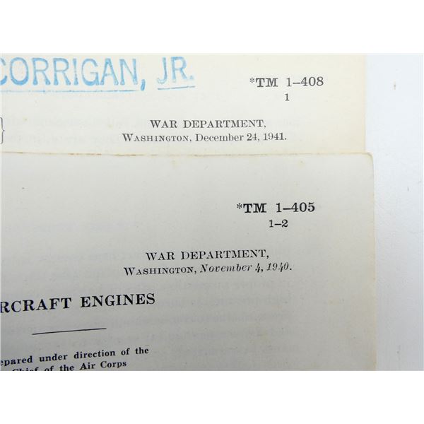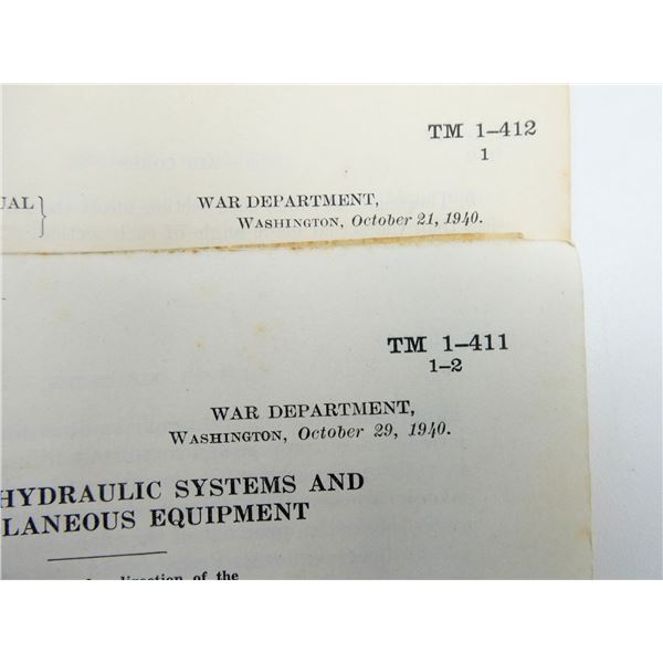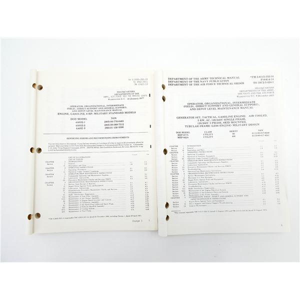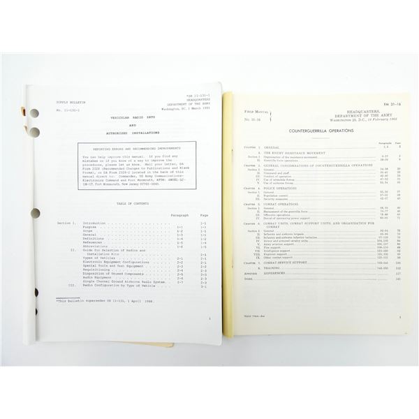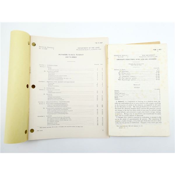 SOFT COVERS, LOT INCLUDES; (6) "WAR DEPARTMENT" TECHNICAL MANUALS LABELLED "TM 1-405" TO "TM 1-412", SERIES NOT COMPLETE / SOME ISSUES MISSING / MAY CONTAIN DUPLICATES, (1) "SERVICE PARTS CATALOG, U.S. GOVERNMENT VEHICLE ELECTRICAL EQUIPMENT" CATALOGUE BY DELCO-REMY, (3) "TM 11-5527, MULTIMETERS" MANUALS BY DEPARTMENT OF THE ARMY, DATED 1956, (1) "FM 31-16, COUNTERGUERRILLA OPERATIONS" FIELD MANUAL BY DEPARTMENT OF THE ARMY, DATED 1963, (1) "SB 11-131-1 SUPPLY BULLETIN" BOOK BY DEPARTMENT OF THE ARMY, DATED 1991, (1) "SUPPLEMENT TO TM5-6115-300-20P" MANUAL BY DEPARTMENT OF THE ARMY, DATED 1964, (1) "GENERATOR SET, TACTICAL, GASOLINE ENGINE: AIR COOLED, 5KW, AC, 120/240V, SINGLE PHASE, 12/208V 3 PHASE, SKID MOUNTED, TUBULAR FRAME (LESS ENGINE) MILITARY DESIGN" MANUAL BY DEPARTMENTS OF THE ARMY, NAVY AND AIR FORCE & (2) "ENGINE, GASOLINE, 6 HP; MILITARY STANDARD MODELS" MANUALS BY DEPARTMENTS OF THE ARMY AND AIR FORCE. SEE PHOTOS.