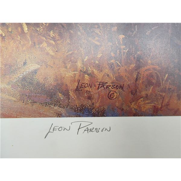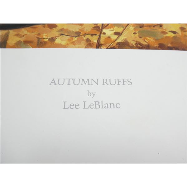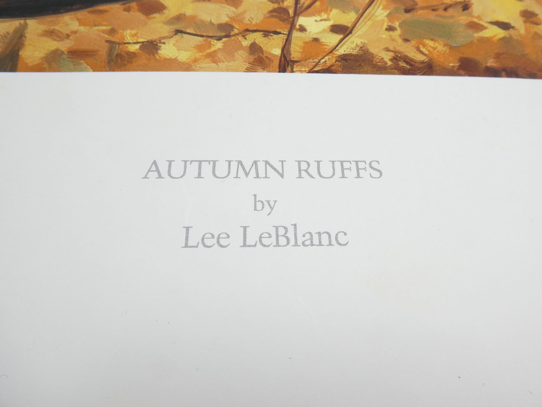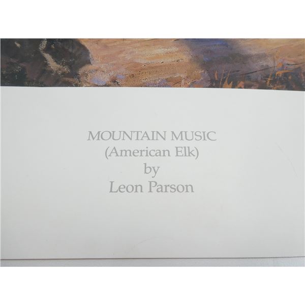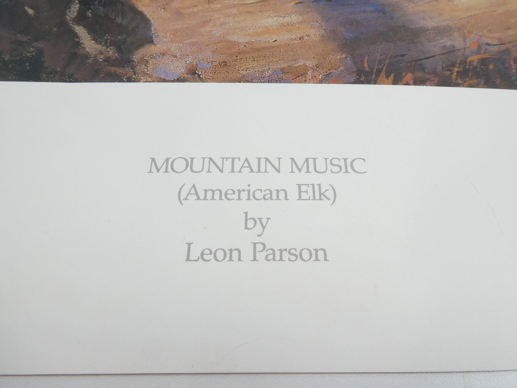 LOT INCLUDES; (1) "AUTUMN RUFFS" PRINT BY LEE LEBLANC, PRINT NO. 790 / 800, SIGNED BY ARTIST, PUBLISHED BY PETERSON PRINTS, COPYRIGHT 1983, SHOWS SOME WEAR & TEAR, APPROX. 29" X 21" & (1) "MOUNTAIN MUSIC (AMERICAN ELK)" PRINT BY LEON PARSON, PRINT NO. 496 / 950, SIGNED BY ARTIST, SHOWS WEAR & TEAR, APPROX. 30" X 20". SEE PHOTOS.