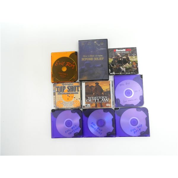 LOT INCLUDES; (5) "EVIL ROY" FIREARMS DVD'S, NOT TESTED, (1) "HOW TO DOPE THE WIND BEYOND BELIEF" DVD, NOT TESTED, (1) BENELLI / STOEGER PROMO DVD, NOT TESTED & (2) PC VIDEO GAMES, "WESTERN OUTLAW, WANTED DEAD OR ALIVE" & "REMINGTON, TOP SHOT, INTERACTIVE TARGET SHOOTING", NOT TESTED. SEE PHOTOS.